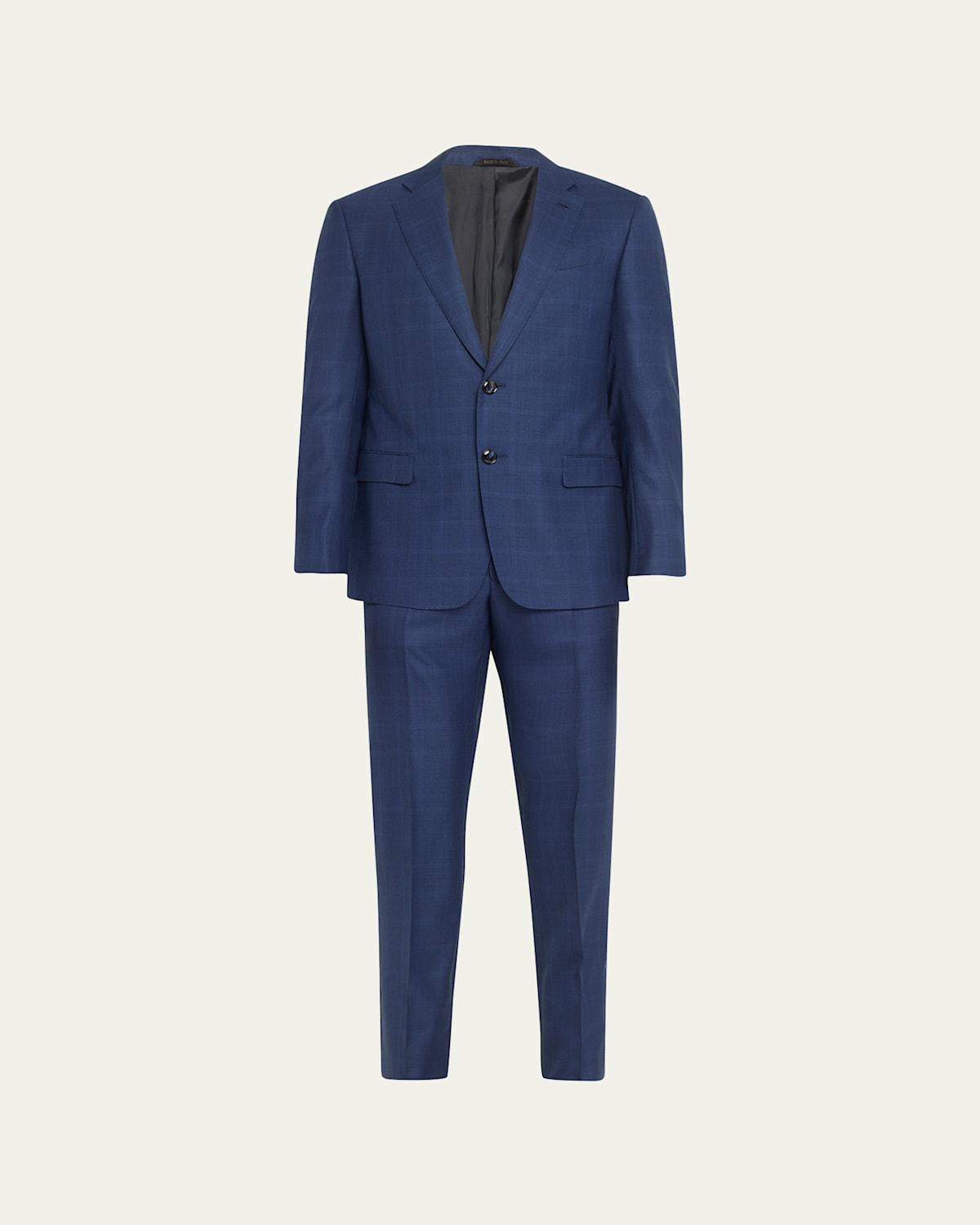 Giorgio Armani suit in tonal windowpane check Notched lapels; two-button closure Chest welt pocket Side flap pockets Unfinished sleeves Double-vented back Flat-front trousers Straight legs Unfinished hem to be tailored to desired length Virgin wool/silk Lining: Acetate/cupro/viscose Dry clean Made in Italy