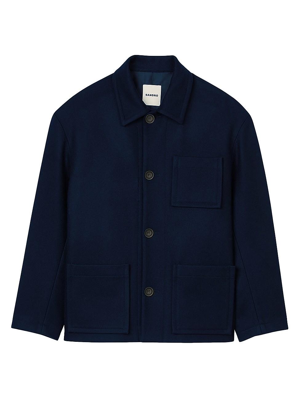 Classic straight-fit wool broadcloth worker jacket with shirt collar, long sleeves and button fastening. Mens Sandro worker jacket Wool broadcloth Classic straight fit Shirt collar Long sleeves Button fastening 2 front patch pockets 2 inside pockets Lined Main fabric: 74% wool, 22% polyamide, 4% cashmere Lining: 100% viscose Pocket lining: 100% cotton Model measurements: 61 Imported. Lsd Rtw - Sandro > Sandro > Saks Fifth Avenue > Barneys. Sandro. Color: Navy Blue. Size: Large.
