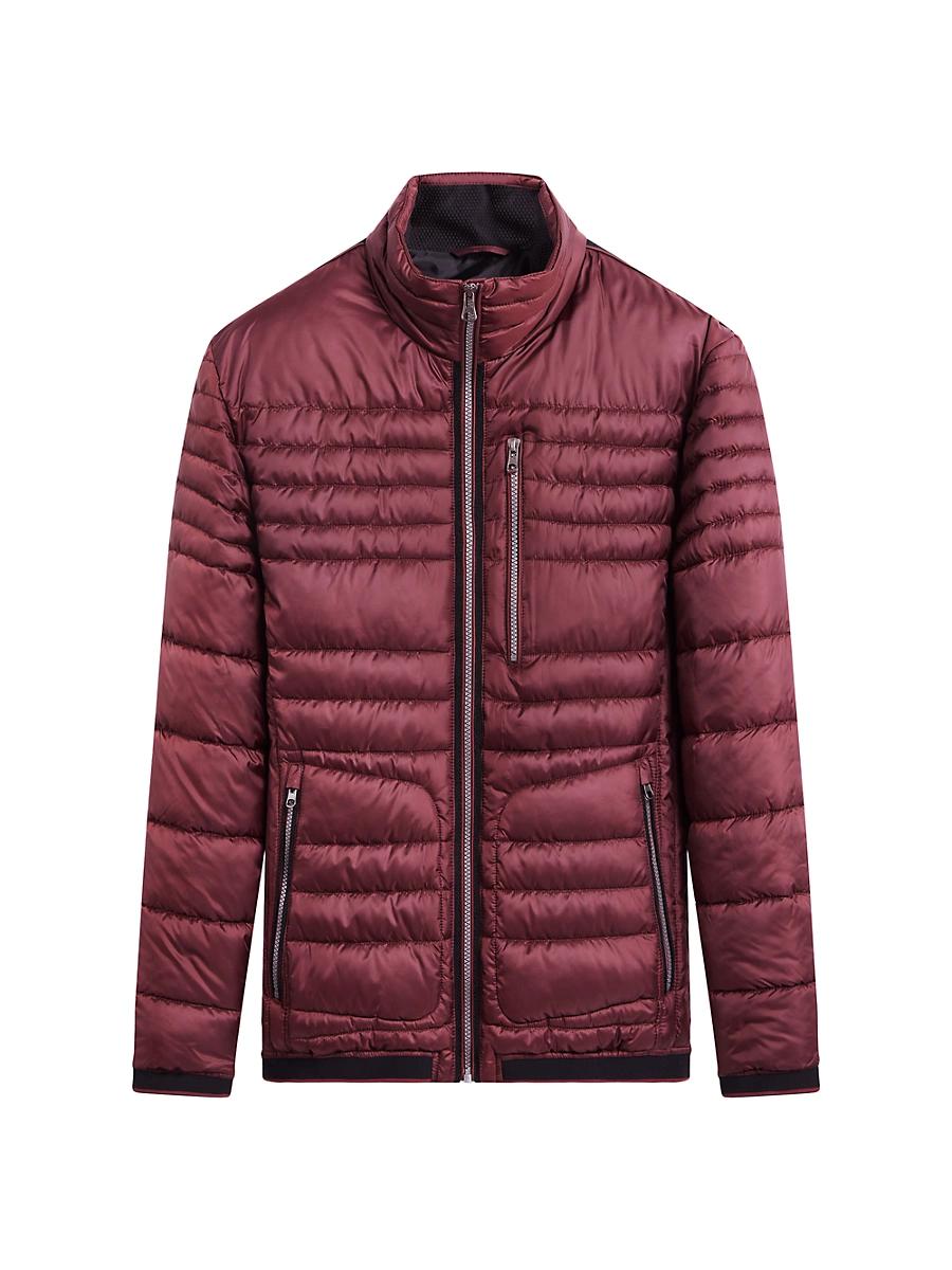 Bugatchi bomber jacket in quilted polyester Three front zip pockets Stand collar Full-zip front Long sleeves Polyester fill Polyester Dry clean Imported Model is 6'1"/185cm.