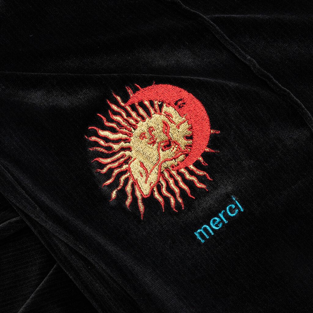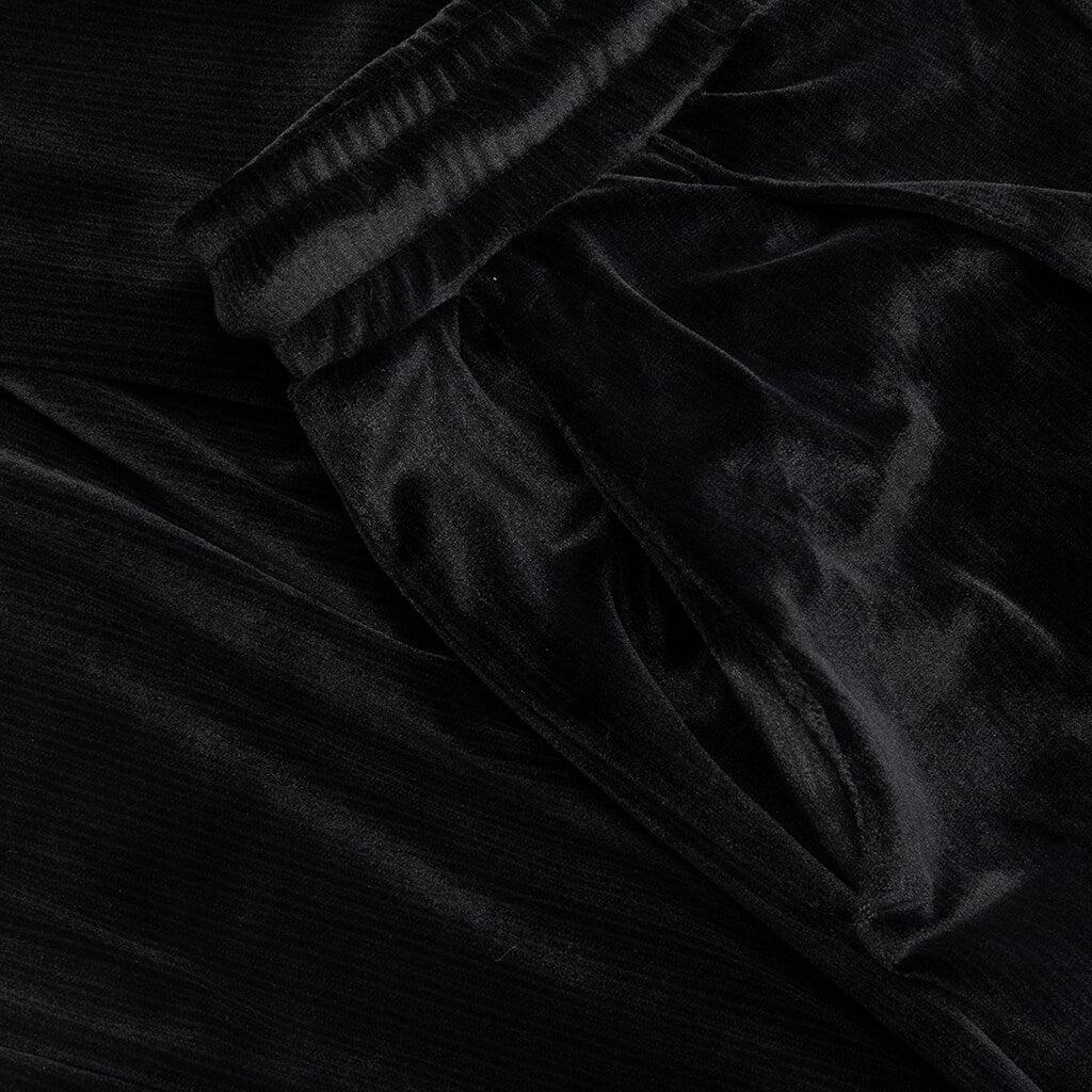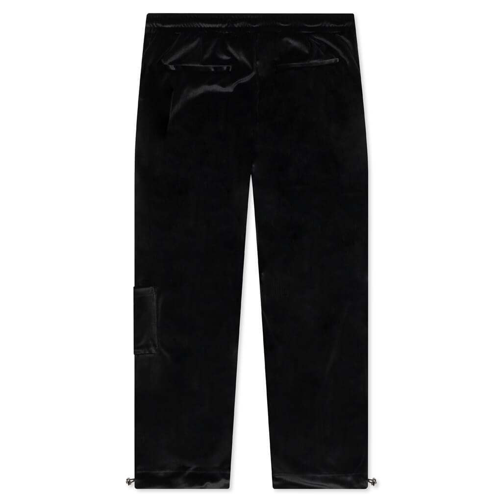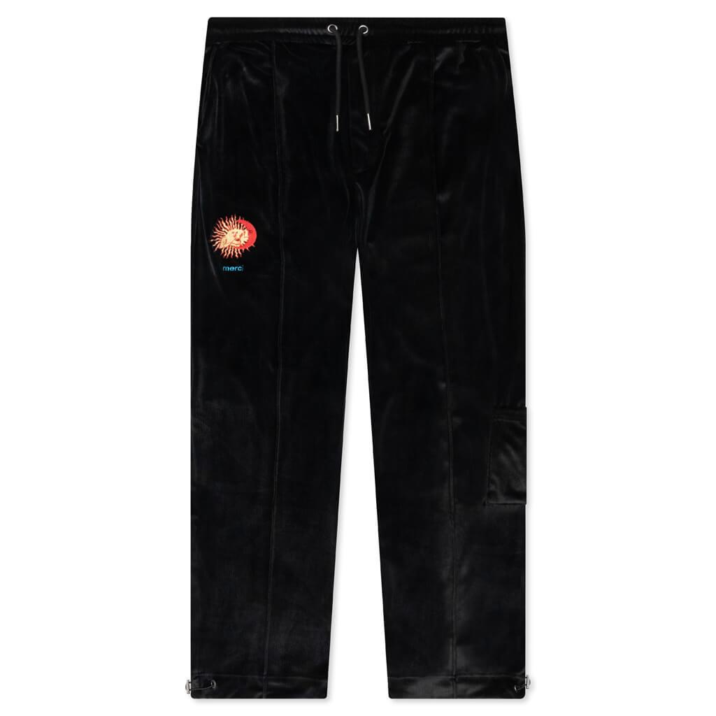 The Jungles Merci Velour Pants are a staple outerwear piece. Cut from a soft velour material, these comfortable pants are perfect for the colder months. Some technical details include an elastic waistband with a drawstring, adjustable cuffs, and side seam pockets. The bright embroidered detail at the thigh completes the design. Velour Elastic waistband Drawstring Side seam pockets Adjustable cuffs Embroidered detailing Style No: VLP-MRC-BLK