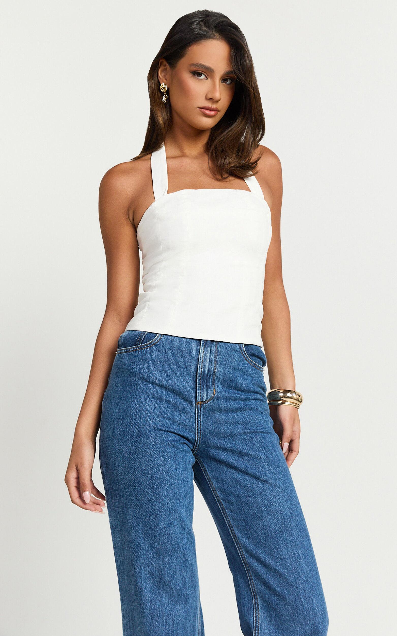 Transform your look with the Mercy Top - a Linen Look Square Neck Halter Top in pristine White that redefines the essence of effortless style. Crafted for the fashion-forward woman, this top serves as a staple piece for any wardrobe, seamlessly bridging the gap between timeless elegance and contemporary chic.Product Details:Zips featureFashion TopsLinen and CottonHalter necklineParty Day wearStandard lengthSleevelessSize and FitSize S / 8 length: 36cm / 14.17inMaterial and Care70% Cotton, 30% LinenNo StretchNatural FibresThe main fabric of this product is made from 100% Natural Fibres. Whilst some of these fibres still have detrimental impacts in their supply chain, Natural Fibres have a reduced overall impact compared to a raw polyester.