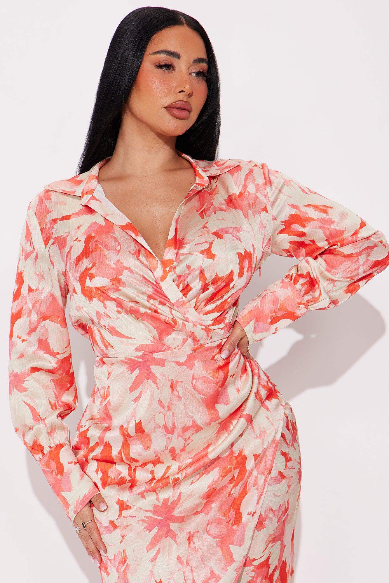 Meredith Satin Shirt Midi Dress - Peach/combo