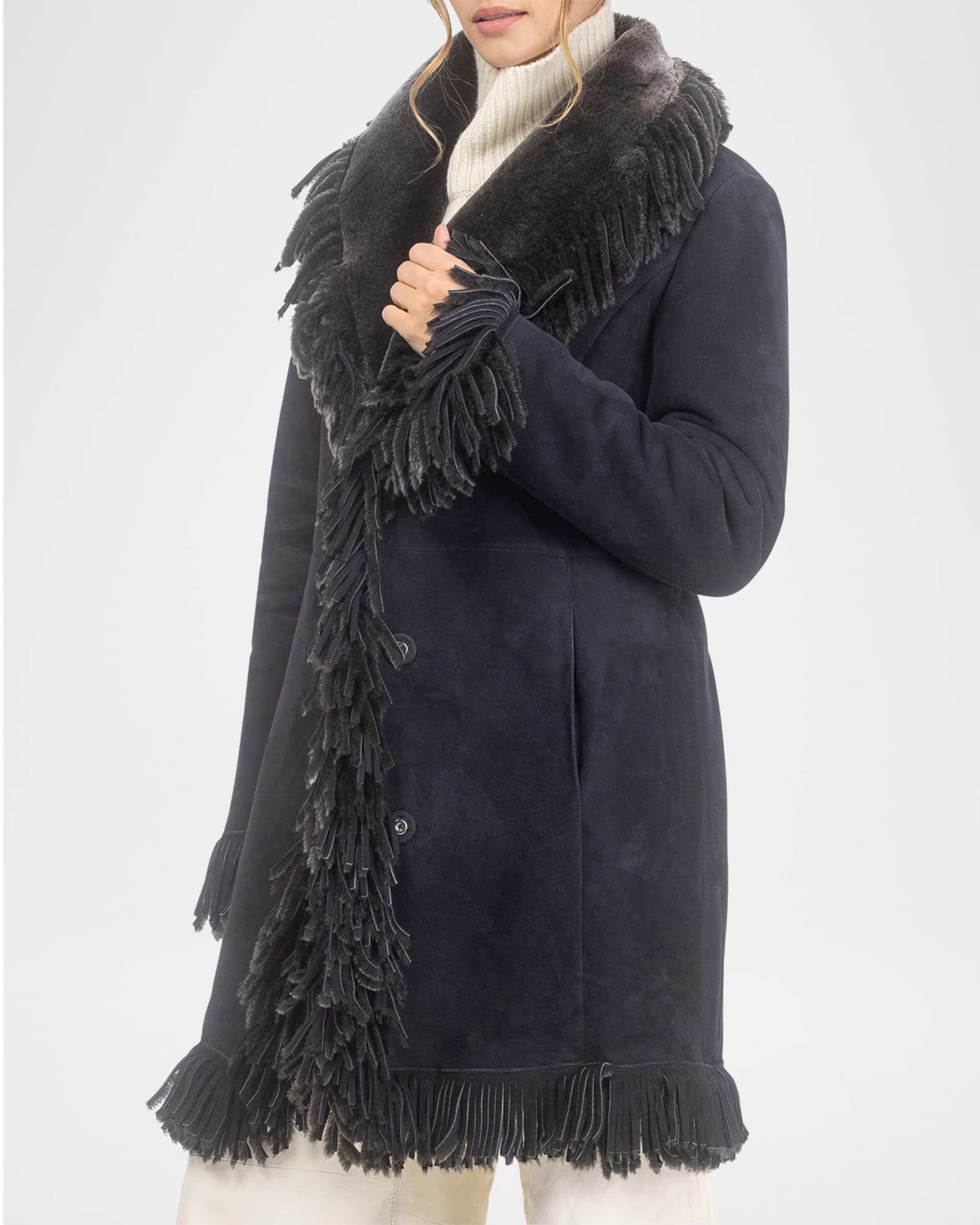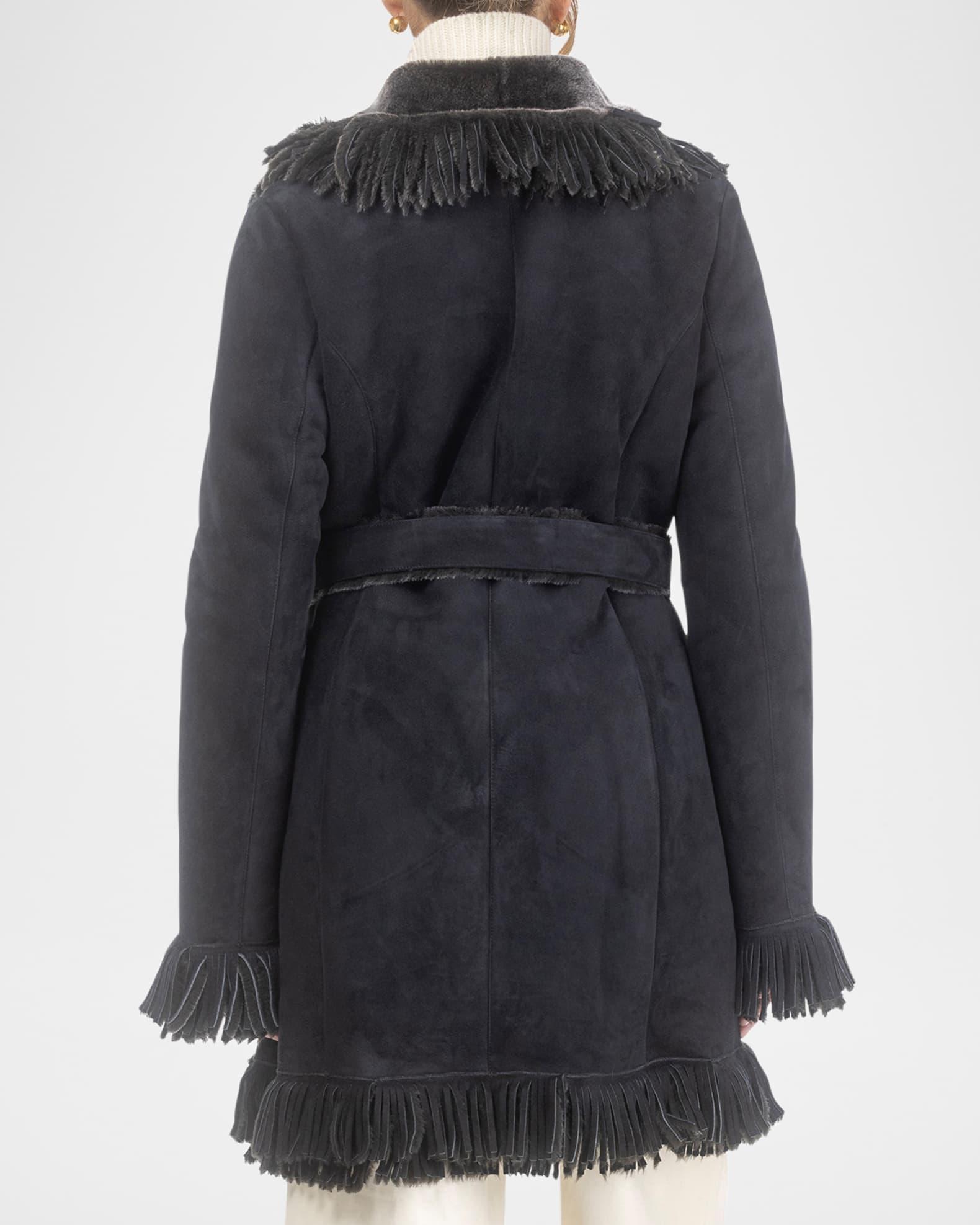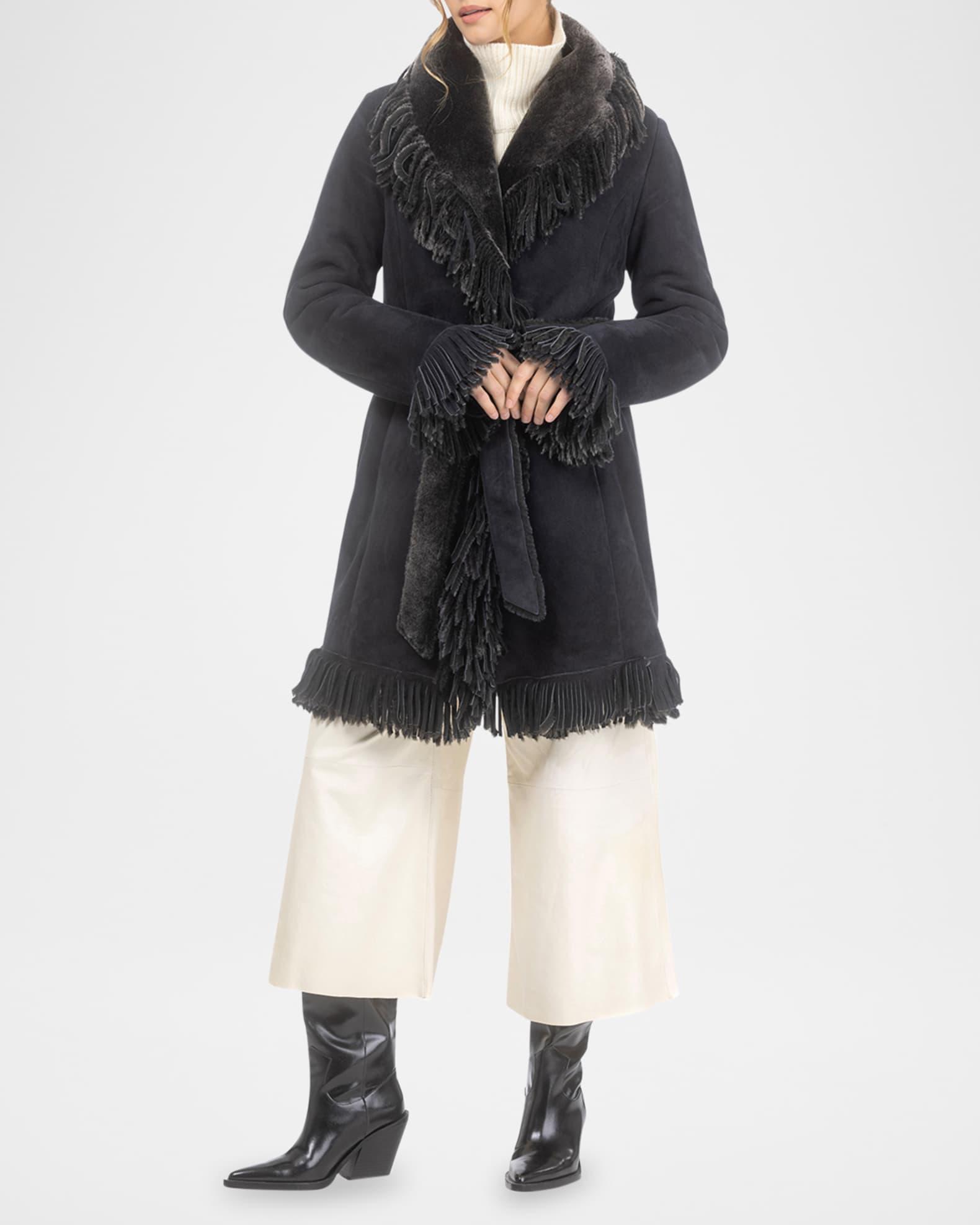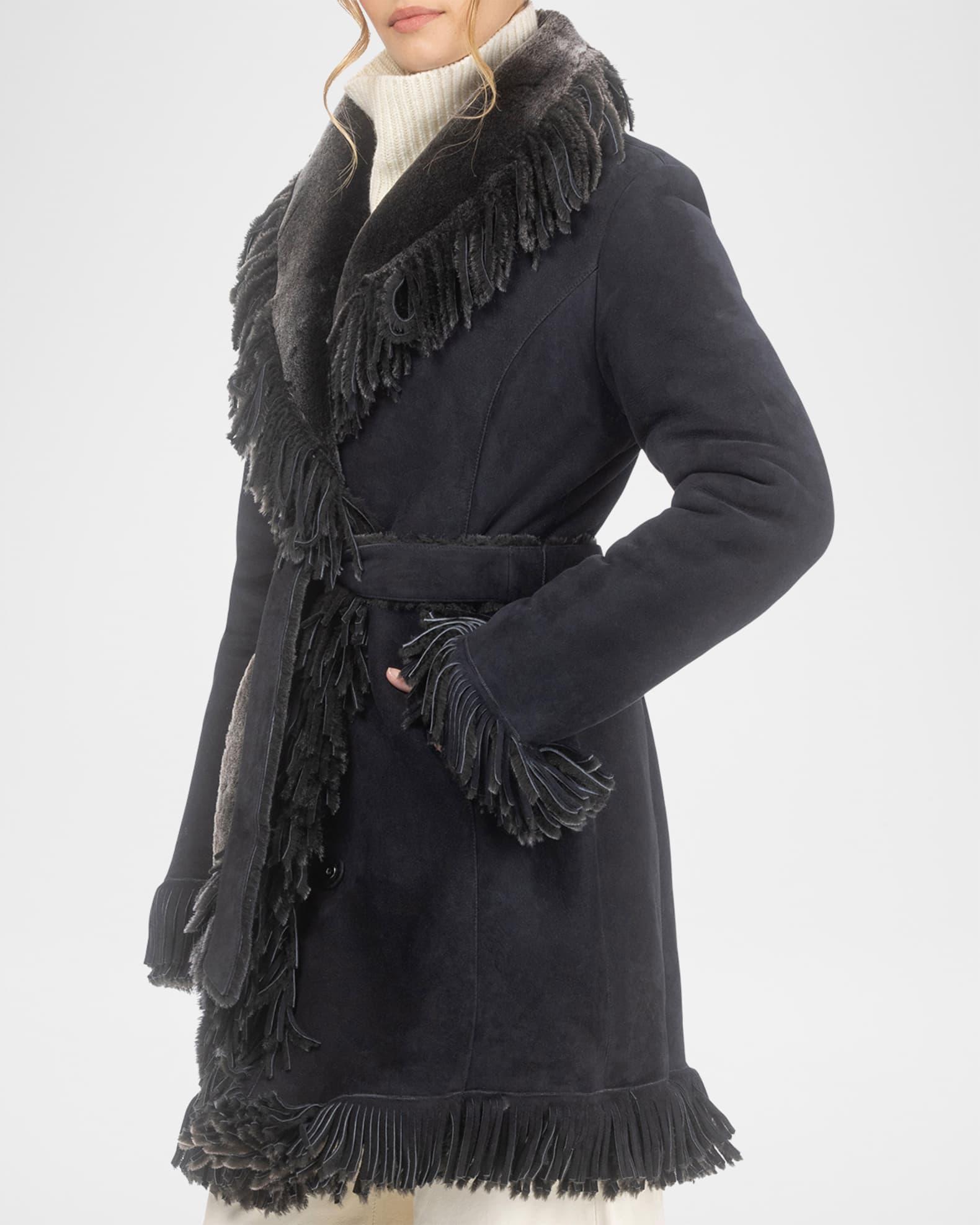 Gorski stroller coat in dyed Merino lamb shearling (Spain) with fringed egdes and a self belt Approx. 35"L from shoulder to hem Shawl lapels; single-breasted front Long sleeves Self-tie belted waist Hip split pockets Straight fit Knee length Concealed snap front closure Shearling Lining: Shearling lined Professional cleaning recommended Imported