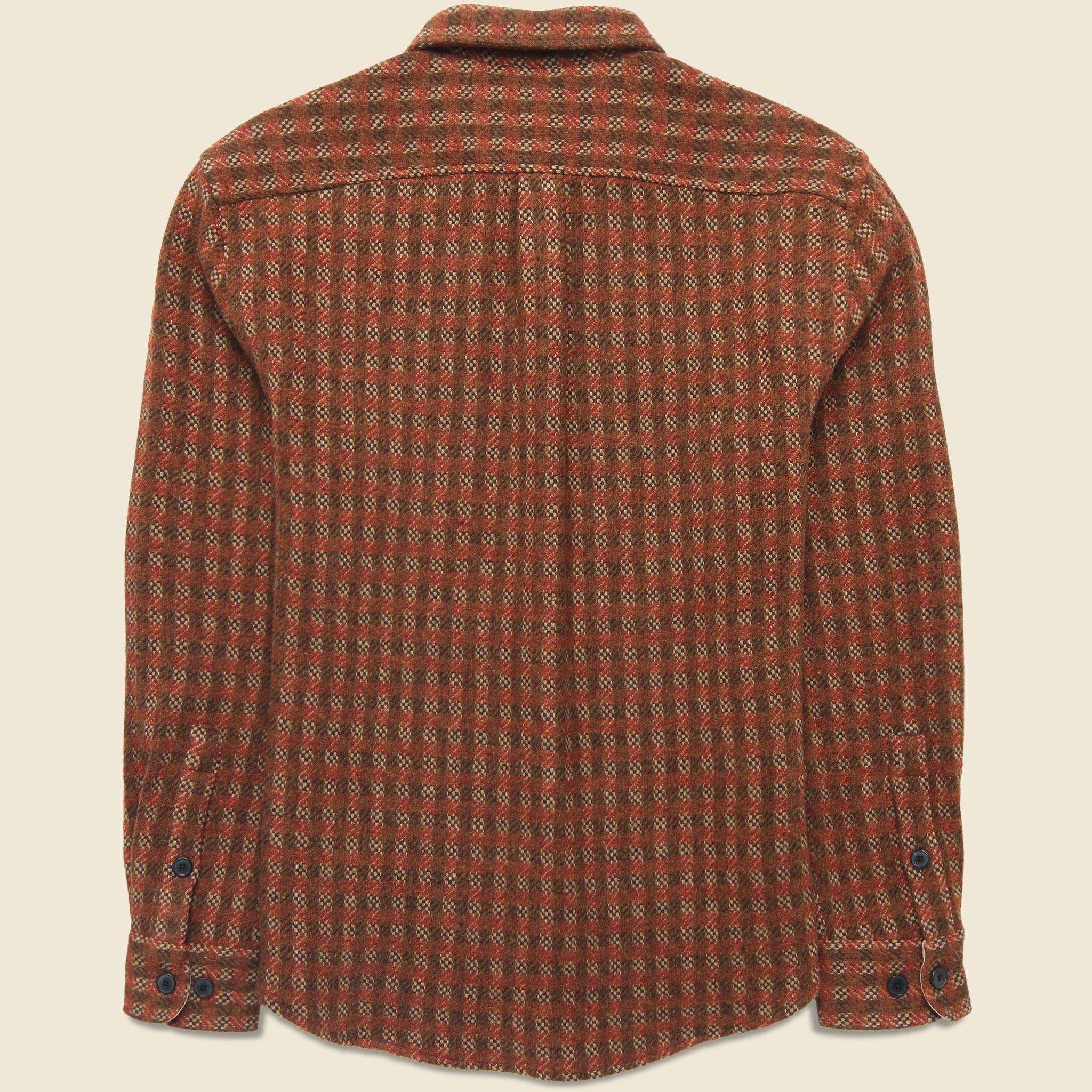 This Overshirt from Portuguese Flannel is expertly crafted from super-soft, midweight Merino wool that's woven with a vintage-inspired tweed pattern and tailored with a perfectly relaxed fit to make it an easy go-to layer. It’s detailed with eco-friendly recycled polyester buttons, a single chest pocket, a spread collar, and a slightly curved hem to round things out. Soft, warm Merino wool Woven tweed pattern Recycled buttons Single chest pocket Spread collar Curved hem Relaxed fit through the chest and shoulder We recommend taking your normal size or taking one size down for a slimmer fit Made in Portugal 100% Merino wool The following measurements are for size Medium: Chest: 44” | Shoulder: 17” | Sleeve: 33 ½” | Length: 28”