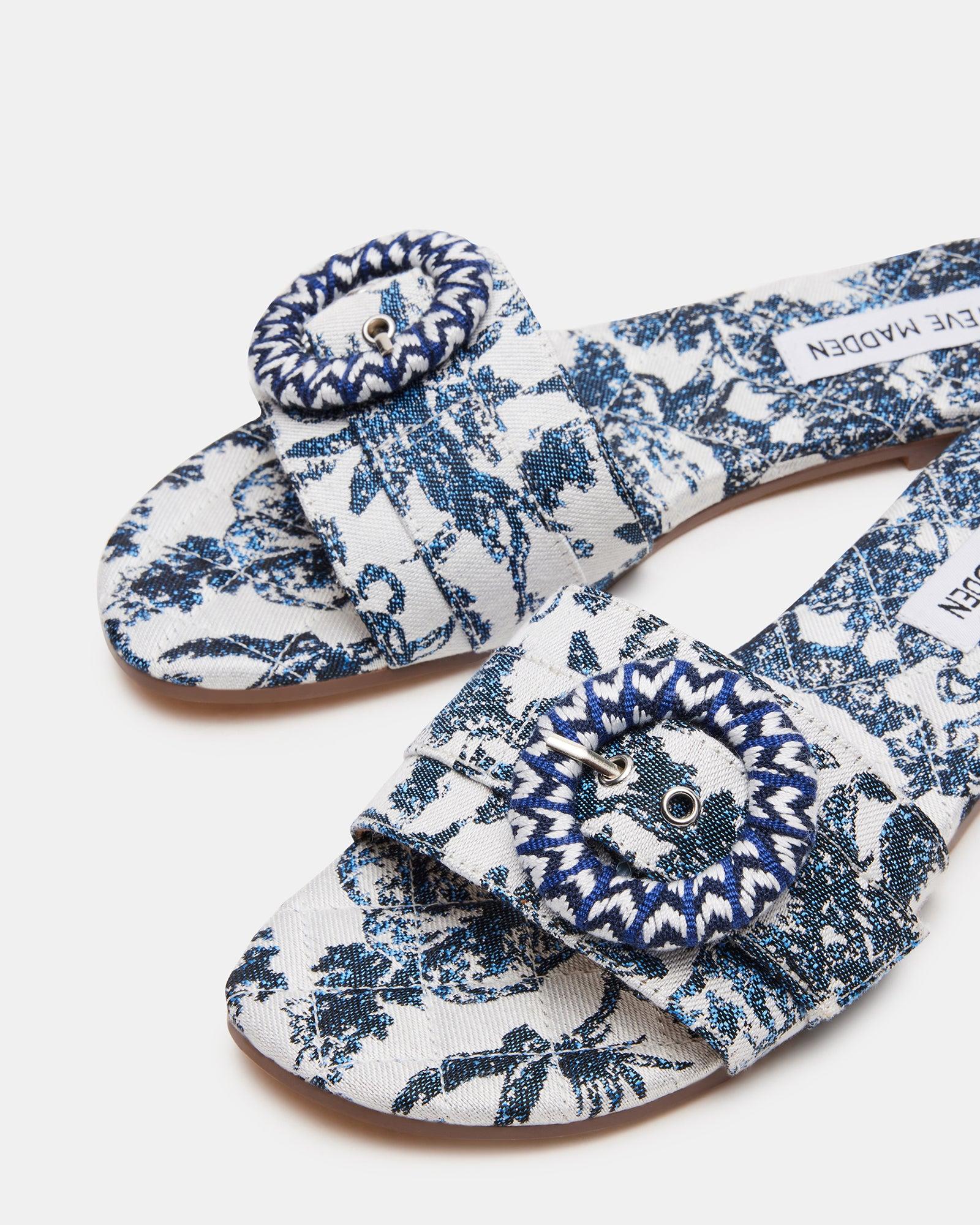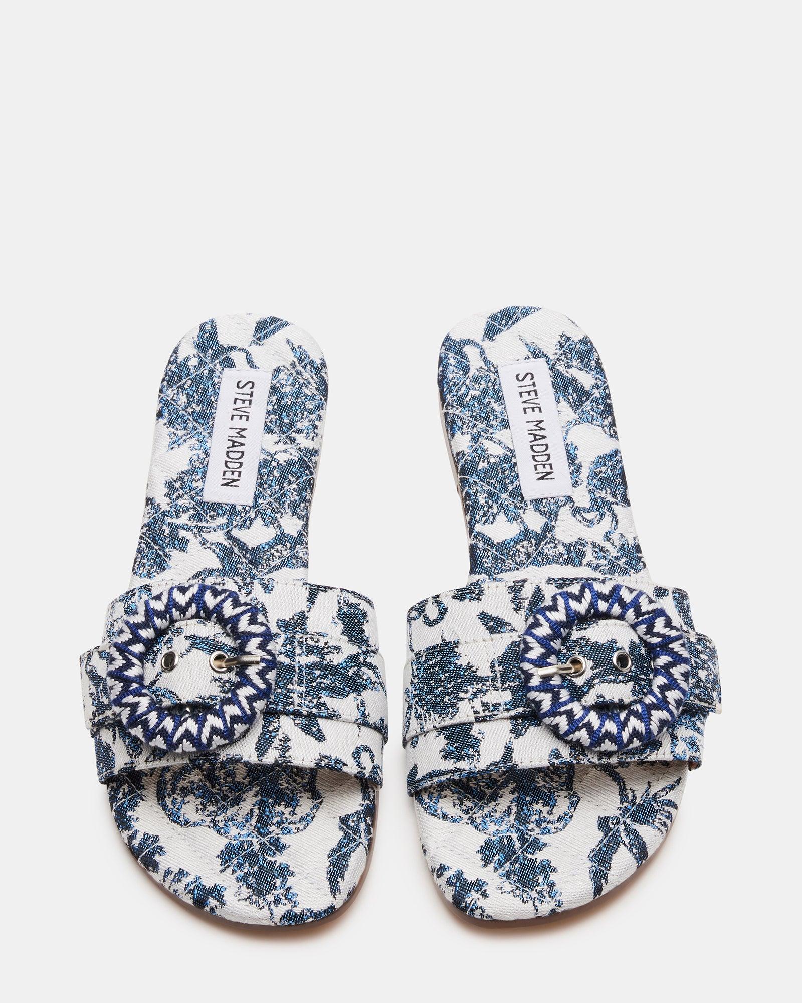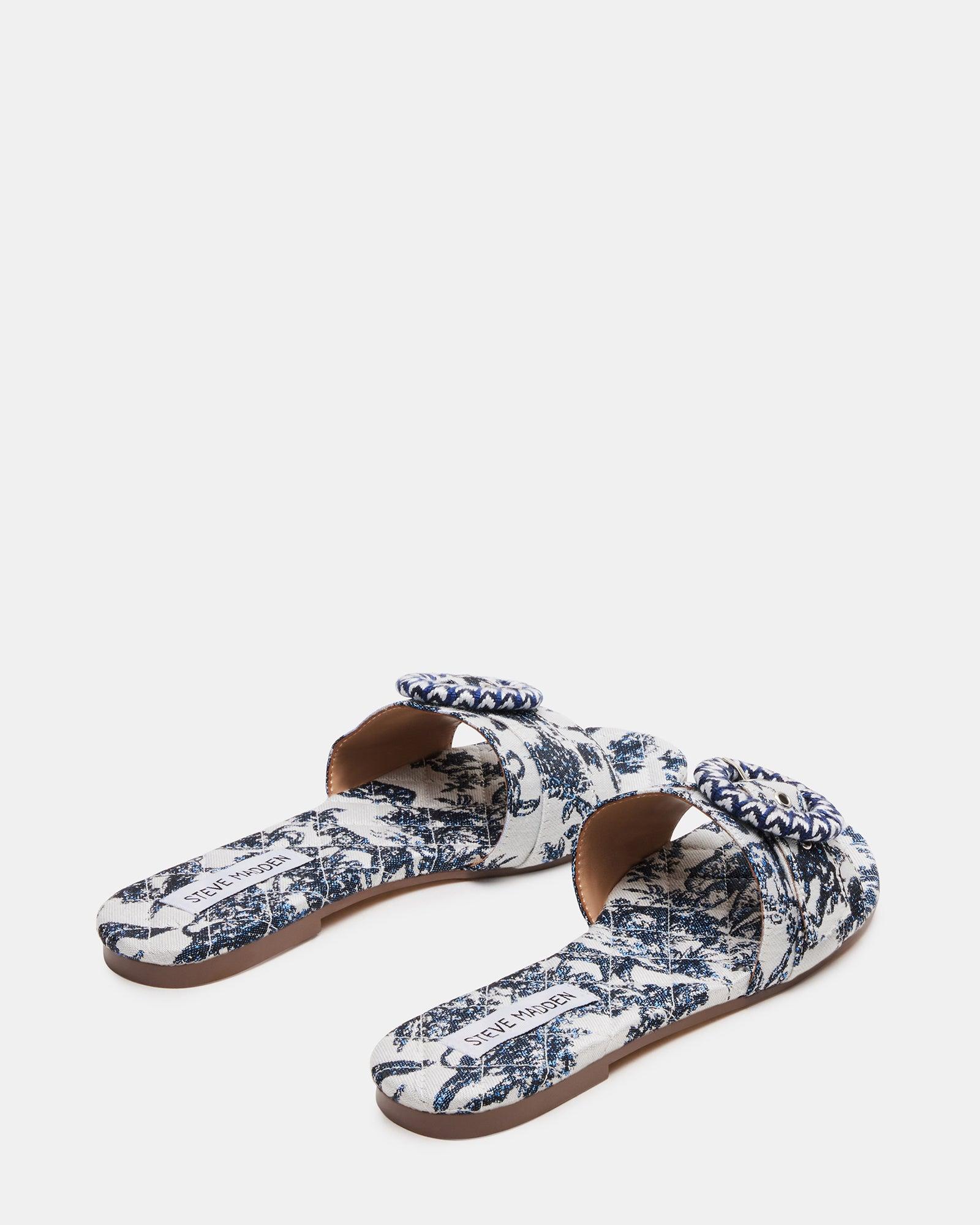 The MERLA flat slide sandal is designed for both style and comfort. The decal on the strap adds a touch of elegance to your step. Perfect for any occasion, these sandals offer the perfect balance of fashion and functionality. .5 inch heel height Textile upper material Synthetic lining Synthetic sock Synthetic sole Imported