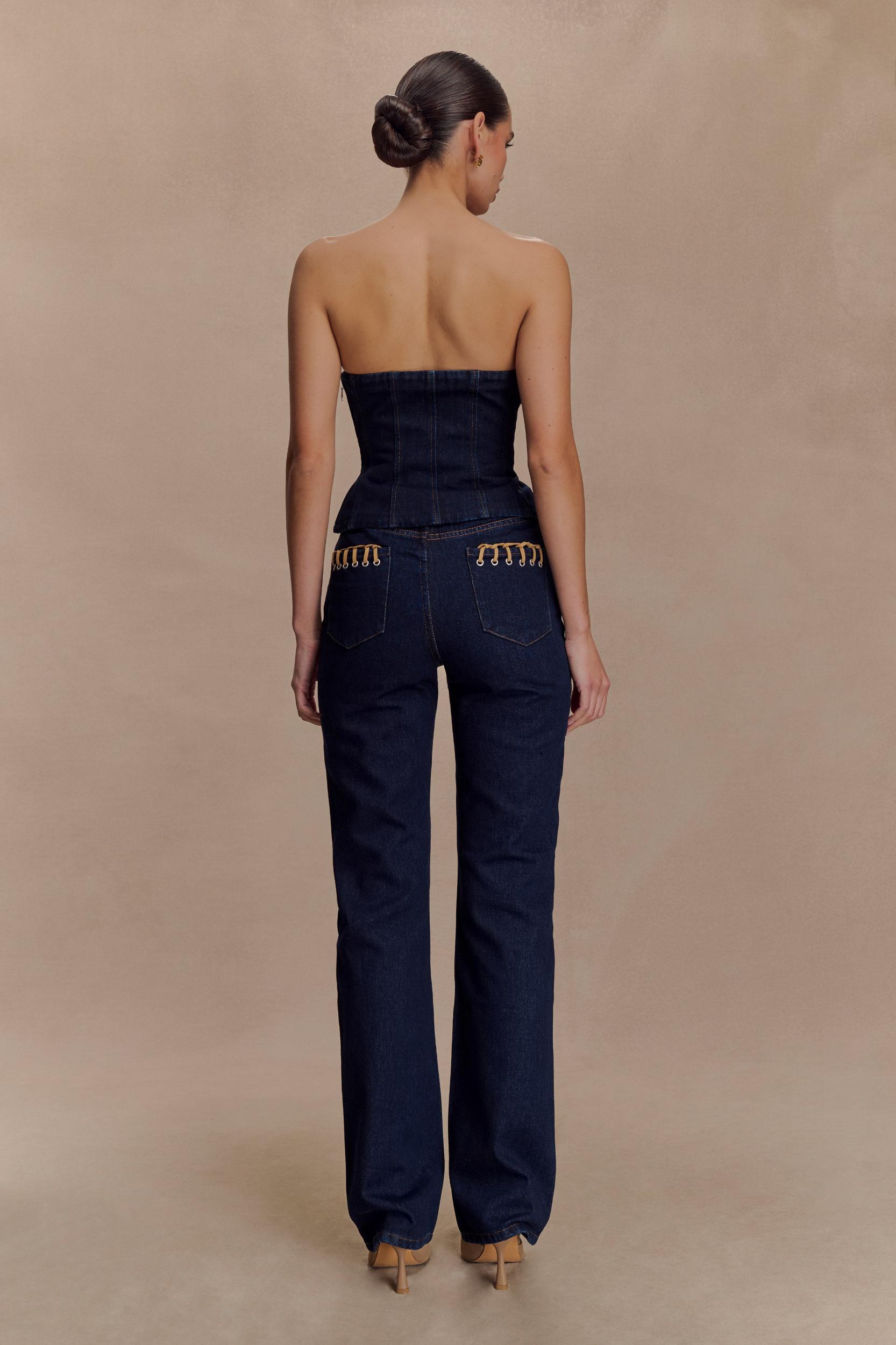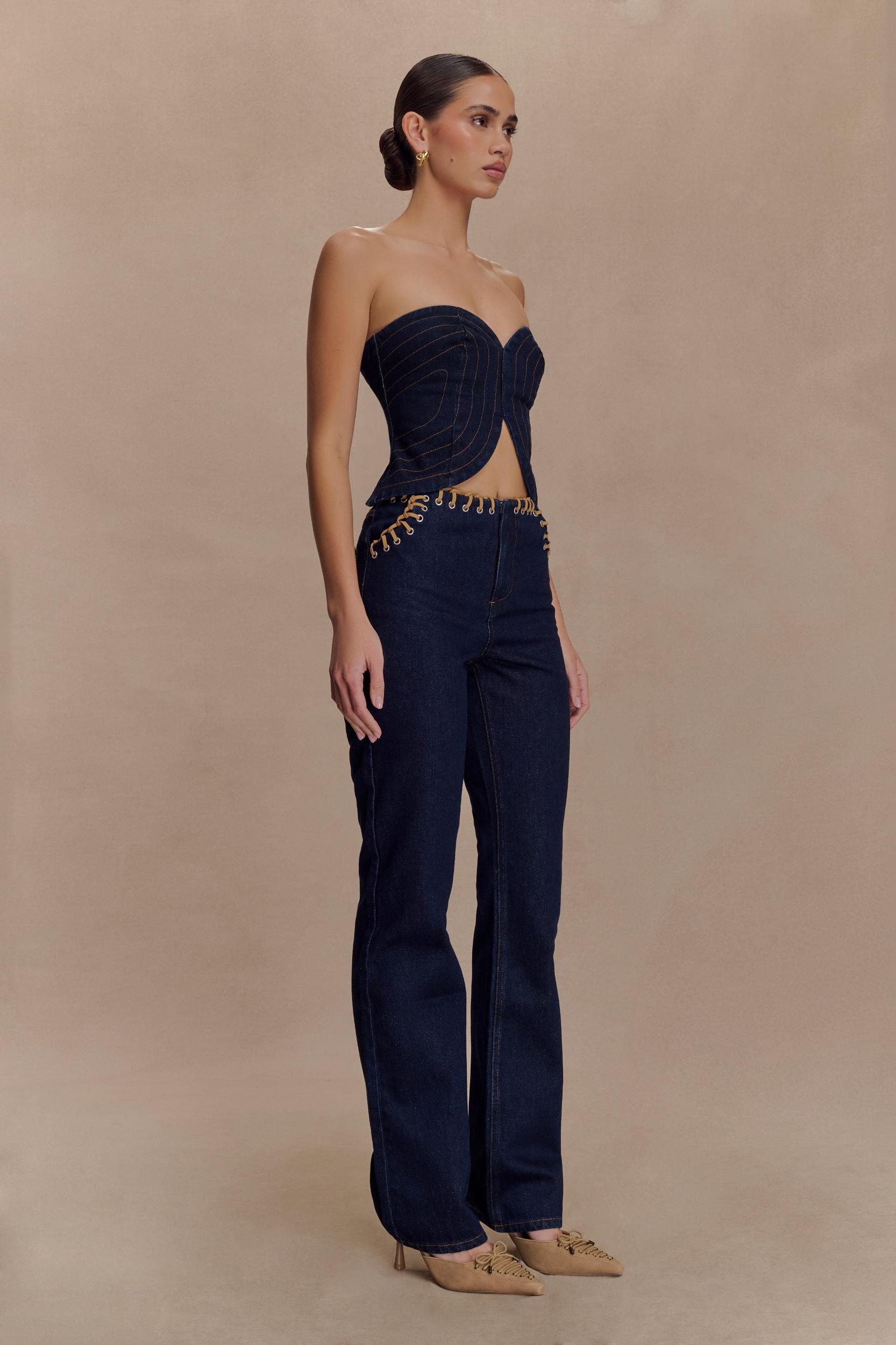 Laced with edge. The MERYL Lace Up Denim Jean delivers an effortless blend of bold and cool-girl polish. Designed with a low-rise waistline and no traditional waistband for a sleek finish, this straight-leg silhouette features lace-up eyelet details along the waist and pocket edges—bringing a touch of statement styling to a classic denim base. Complete with functional front and back pockets and a fly front closure, these jeans are made for moments when your denim needs to do more.