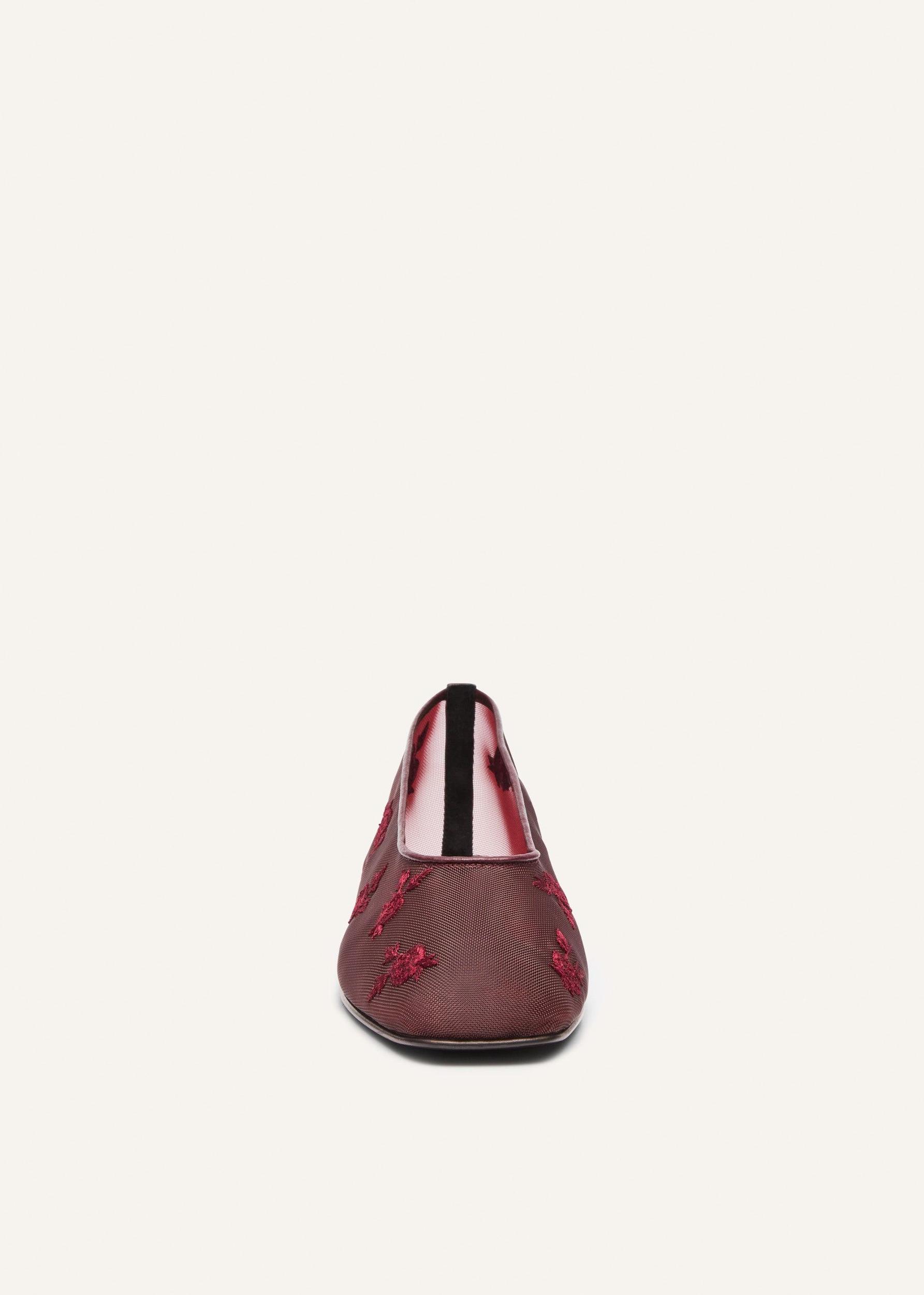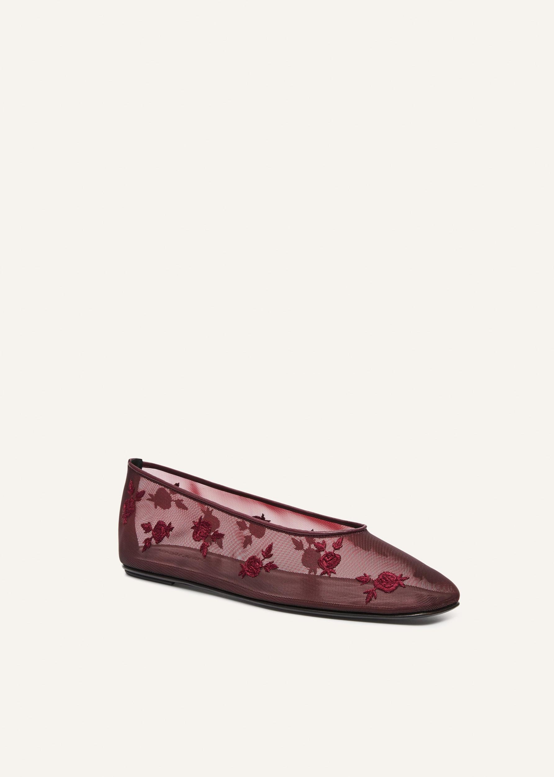 A modern round-toe ballet flat offers effortlessly chic styling with its unique sculptural shape, crafted in Italy from a leather sole and insole and a transparent mesh upper. Added all-over floral embroidery on the mesh adds a playful, feminine touch.