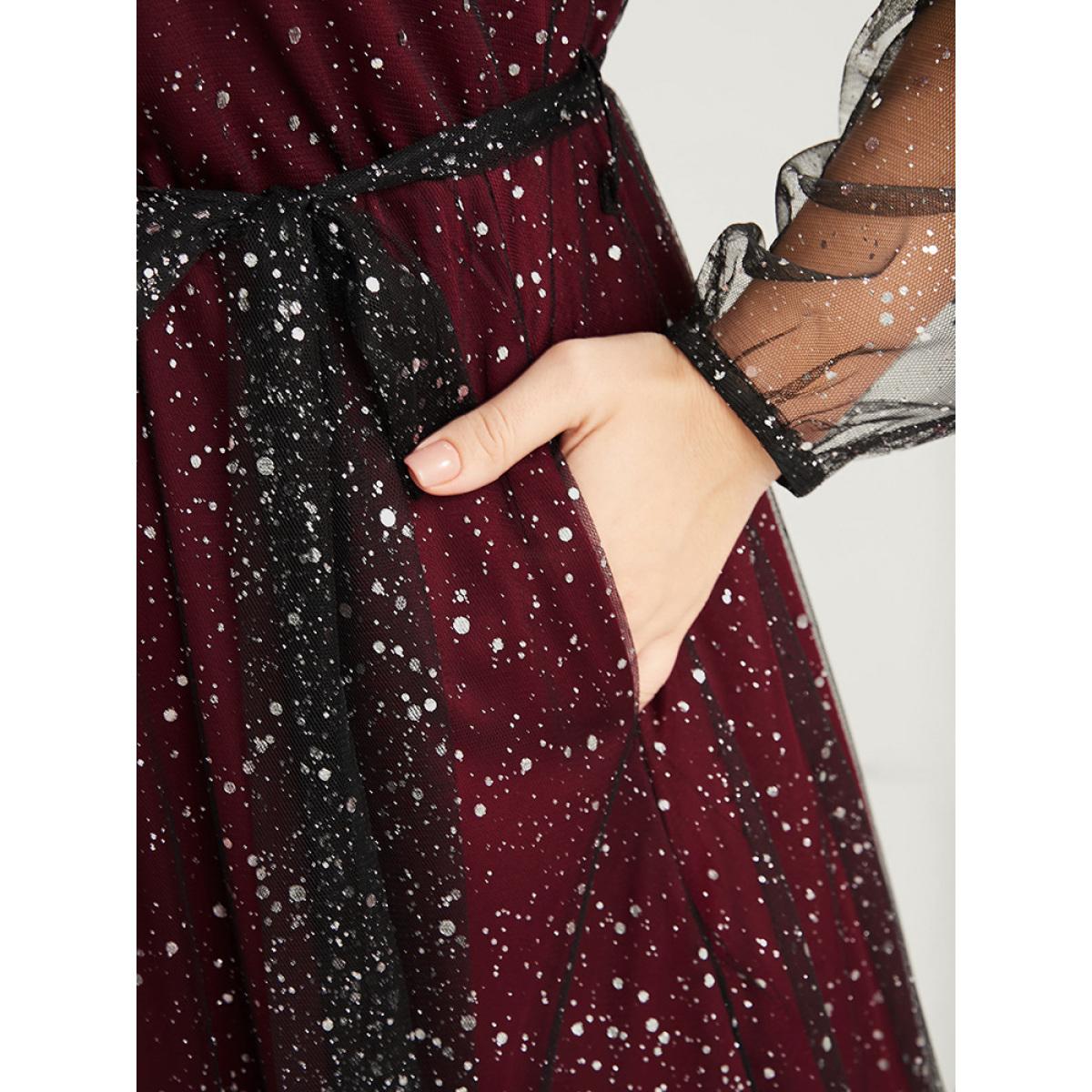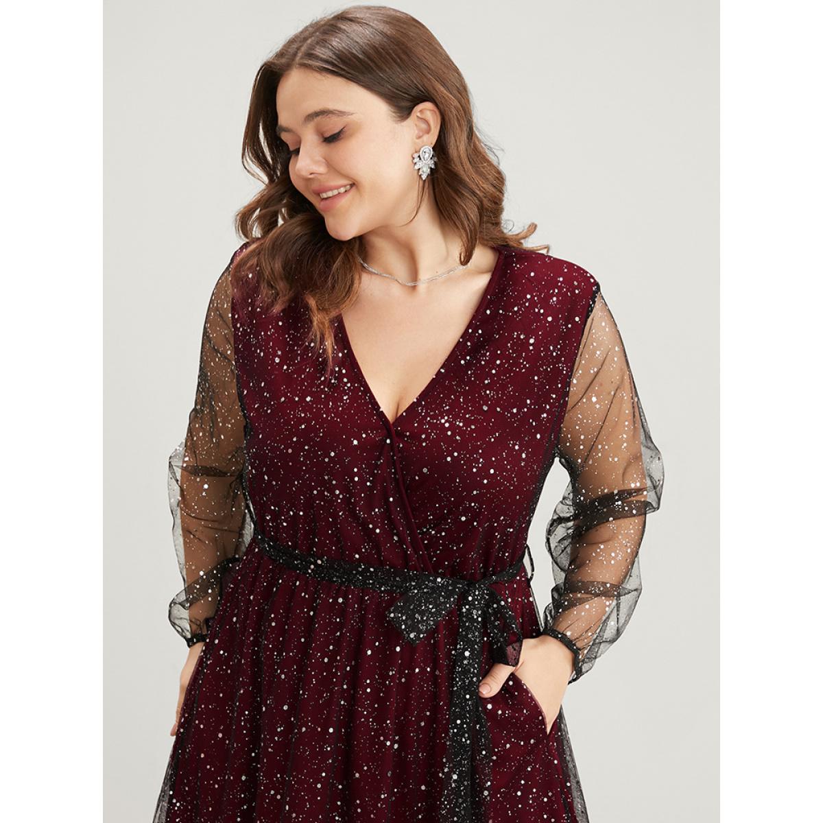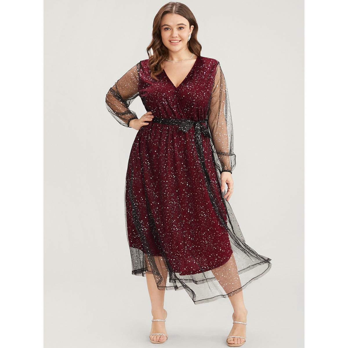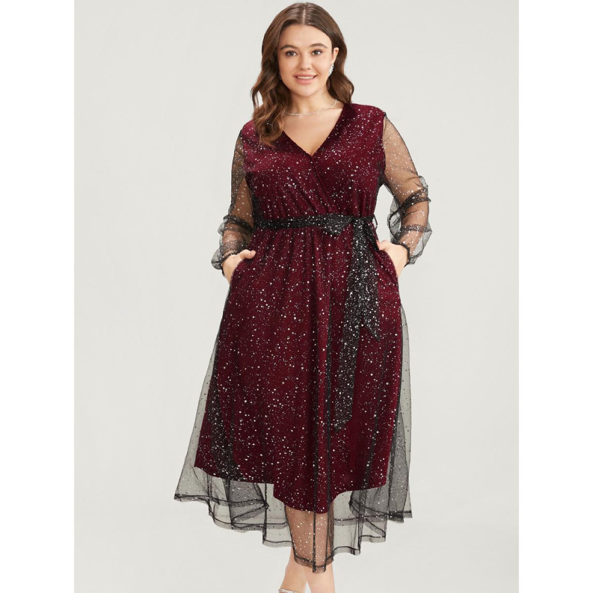 Mesh Lace Plain Patchwork Plus Size Women Going out Midi Dress Lantern Sleeve Long Sleeve V Neck Pocket Belt Party Dresses BloomChic Product Image
