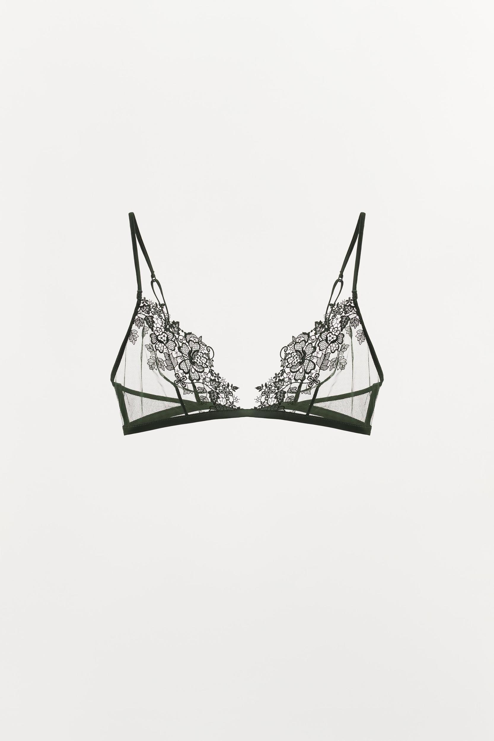 Triangle bra made of mesh fabric. Adjustable thin straps. Matching lace appliqué detail. Metal hook-and-eye back closure.