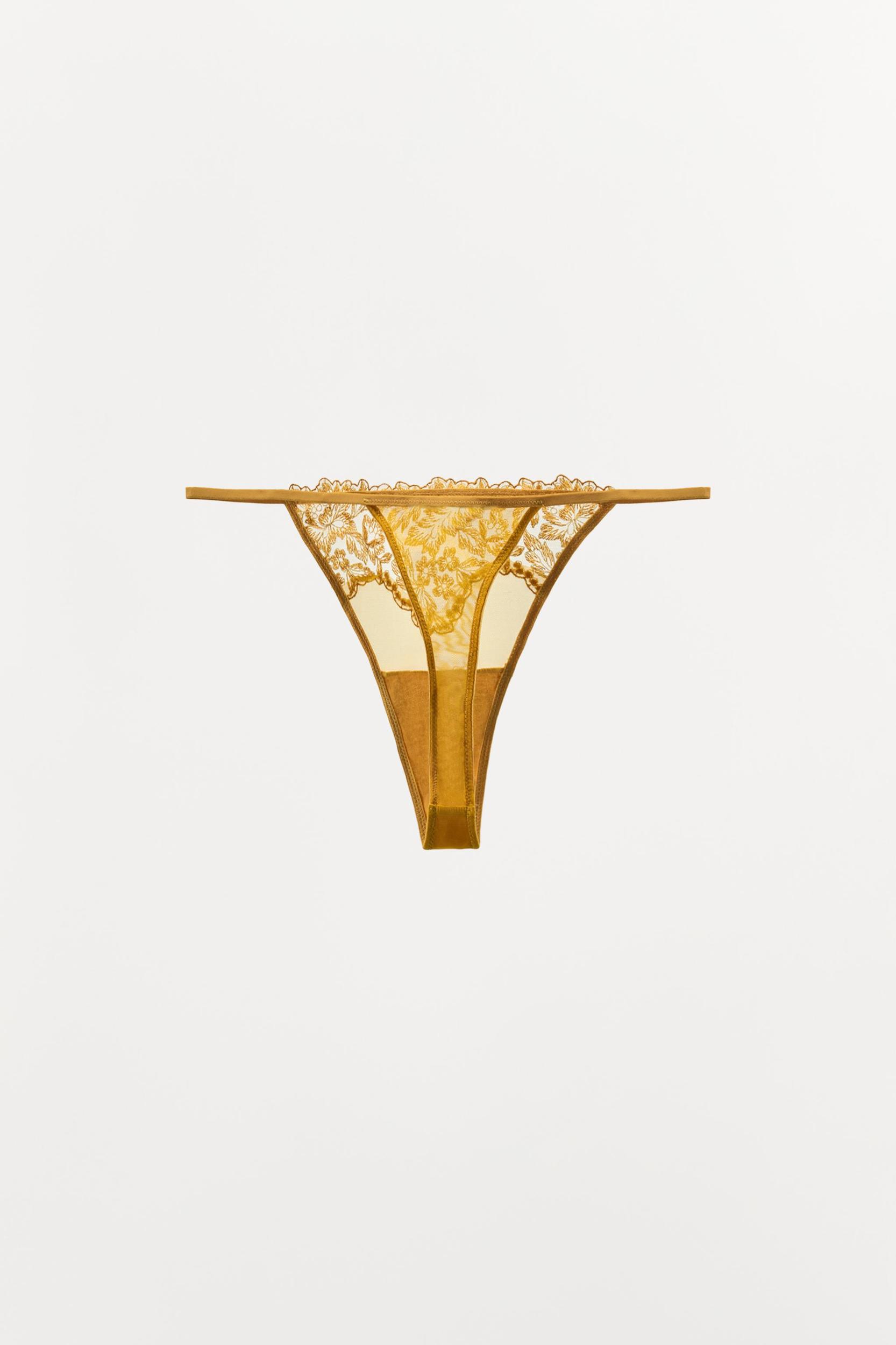 Thong with a thin, elastic waistband. Tonal lace appliqué detail.