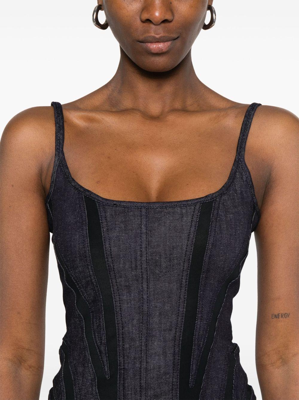 mesh-panel denim midi dress
