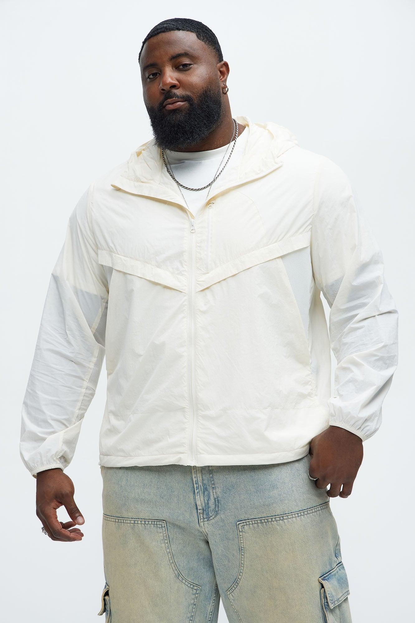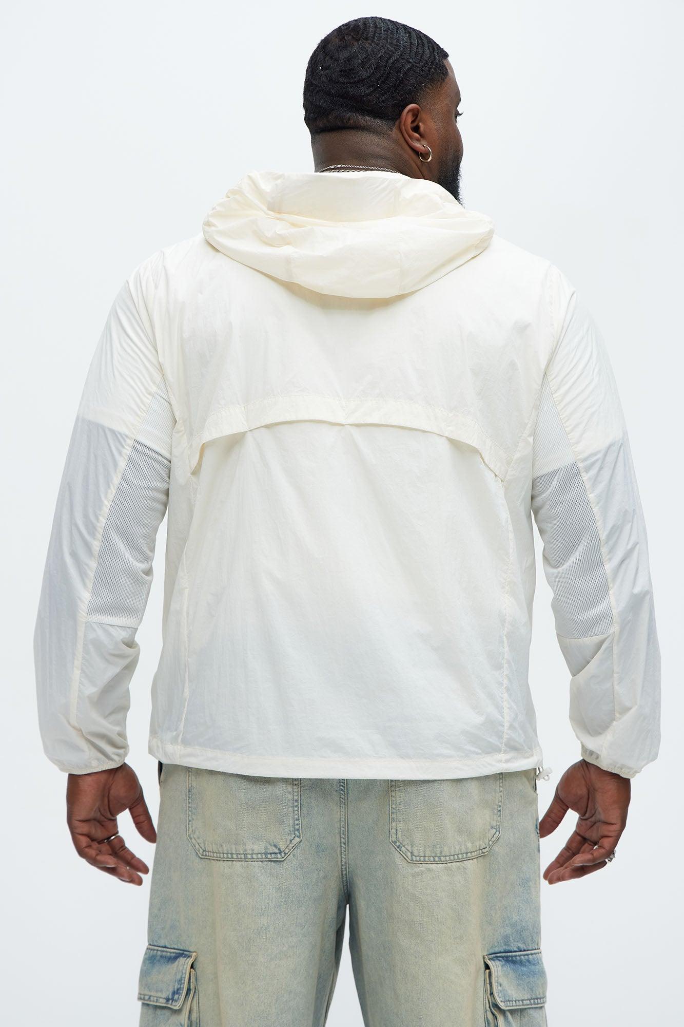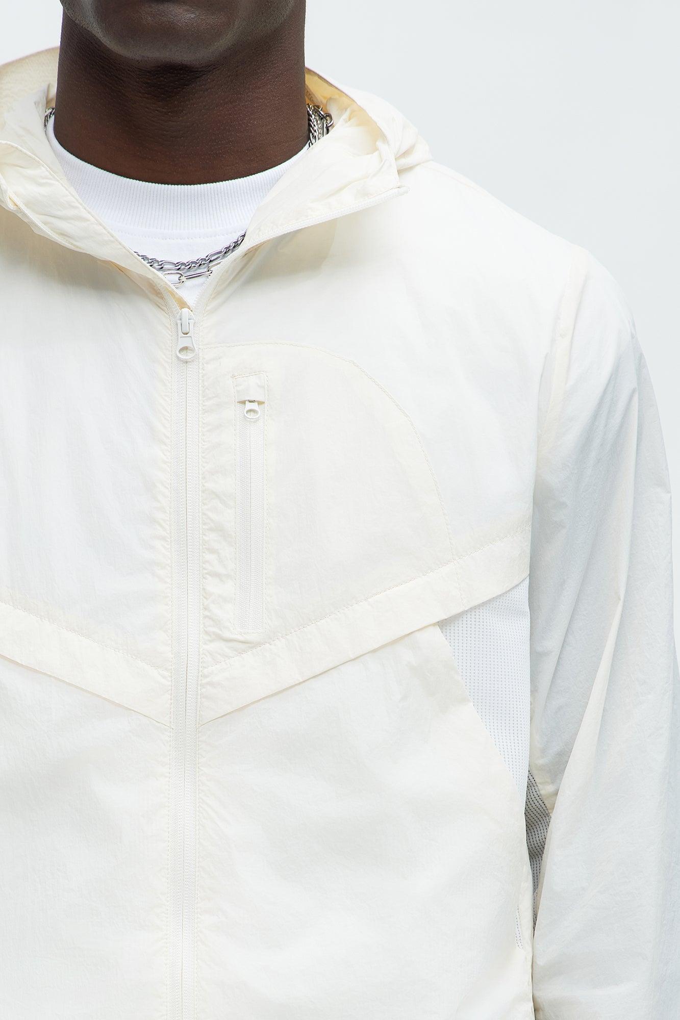 Available In Off White. Mock Neck Hooded Front Full Zipper Closure Front Mesh Venting Details Front Paneling Details Sleeve Venting Details Back Venting Detail Elastic Cuffs Long Sleeves Adjustable Cinch Hem Detail Main Shell: 100% Nylon Panel Shell: 80% Polyester , 20% Spandex Imported California Proposition 65 WARNING: Cancer and Reproductive Harm - www.P65Warnings.ca.gov.