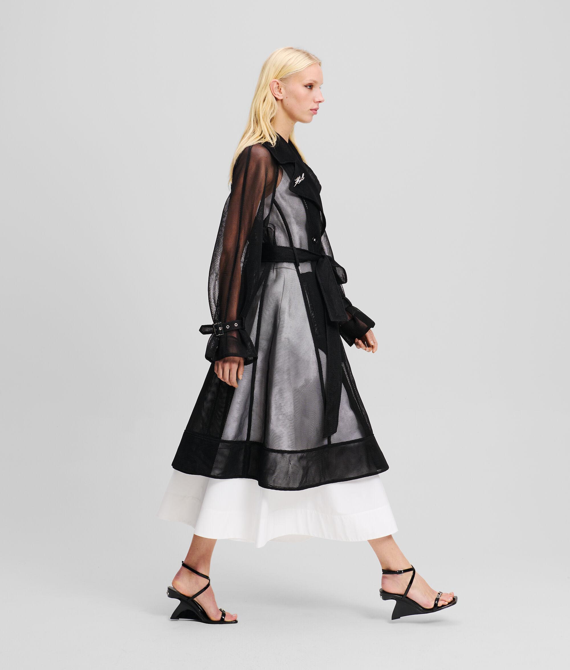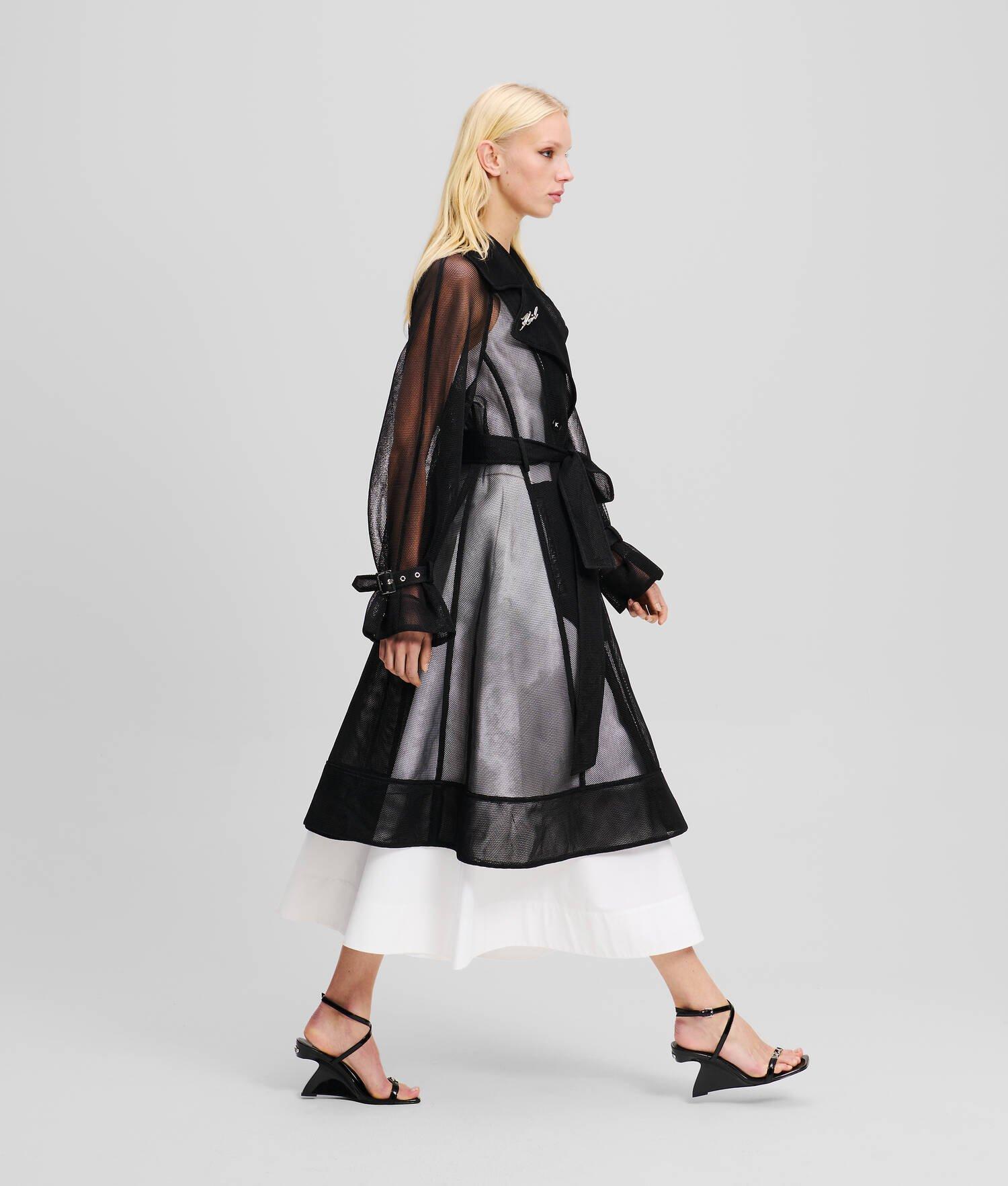 A contemporary take on the classic trench, this sheer mesh coat features a double-breasted silhouette with branded buttons. The cinching waistbelt allows for a personalized fit, while the polished KARL Signature pin adds a touch of distinction.