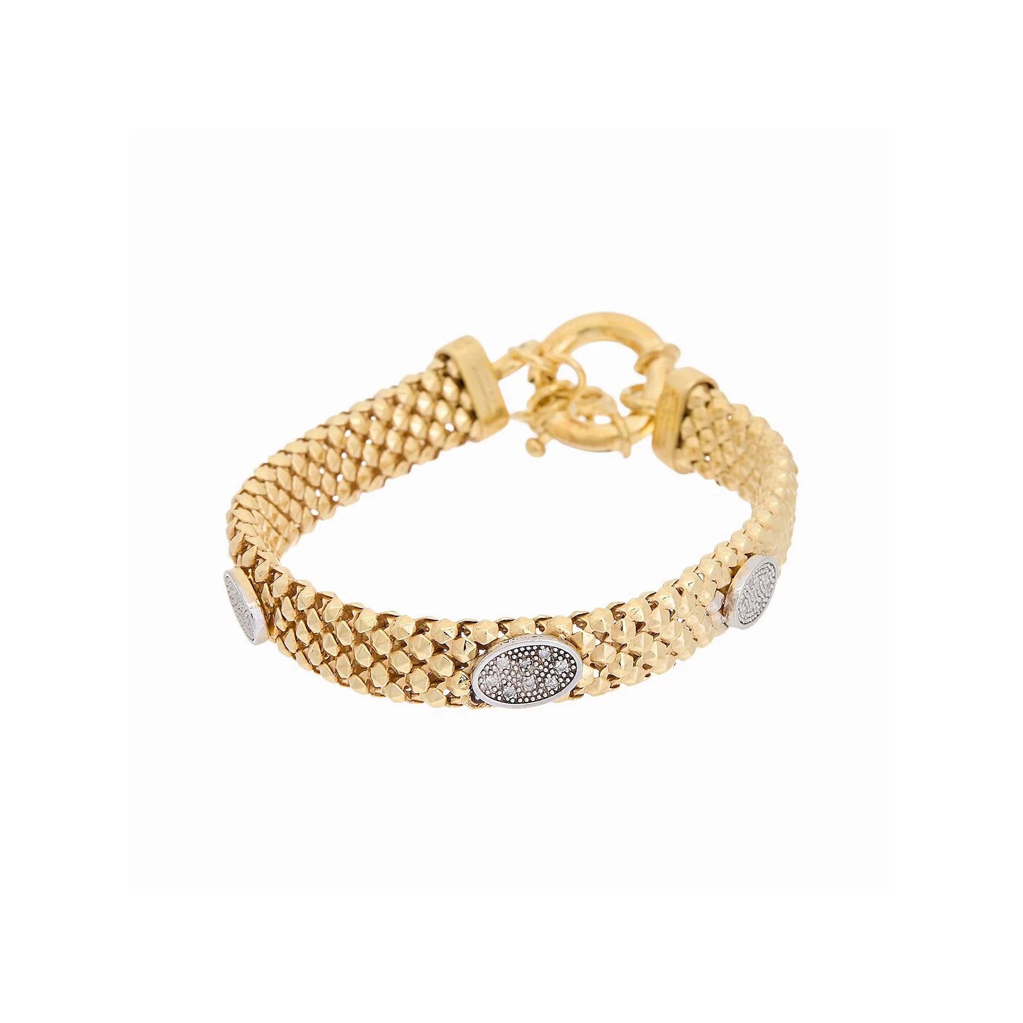 Add elegant final touches to any outfit with this Meshmerise 1/8 Carat T.W. diamond oval charm bracelet. Click on this JEWELRY & WATCHES GUIDE to learn about fit, styles, materials and more! Add elegant final touches to any outfit with this Meshmerise 1/8 Carat T.W. diamond oval charm bracelet. Click on this JEWELRY & WATCHES GUIDE to learn about fit, styles, materials and more! FEATURES Bracelet length: 7 in. Clasp: spring-ring Nickel free Metal: sterling silver Silver Plating: rhodium Gold Plating: 18k gold Finish: polished Packaging: boxed ImportedDIAMOND DETAILS Total weight: 1/8 ct. Color Grade: G-H Clarity Grade: SI1, SI2 Shape: round Setting: prong Gemstones may have been treated to enhance their appearance. Special care may be required. Please visit our Gemstone Treatment & Special Care Guide for more information. Image(s) may be enlarged to show detail. Diamond weights are approximate. Diamond Total Weights may vary between .01 and .13 ct. Some diamonds consist of fewer than 17 facets. Size: 7. Color: Gold Tone. Gender: female. Age Group: adult. Material: Gold Plate.