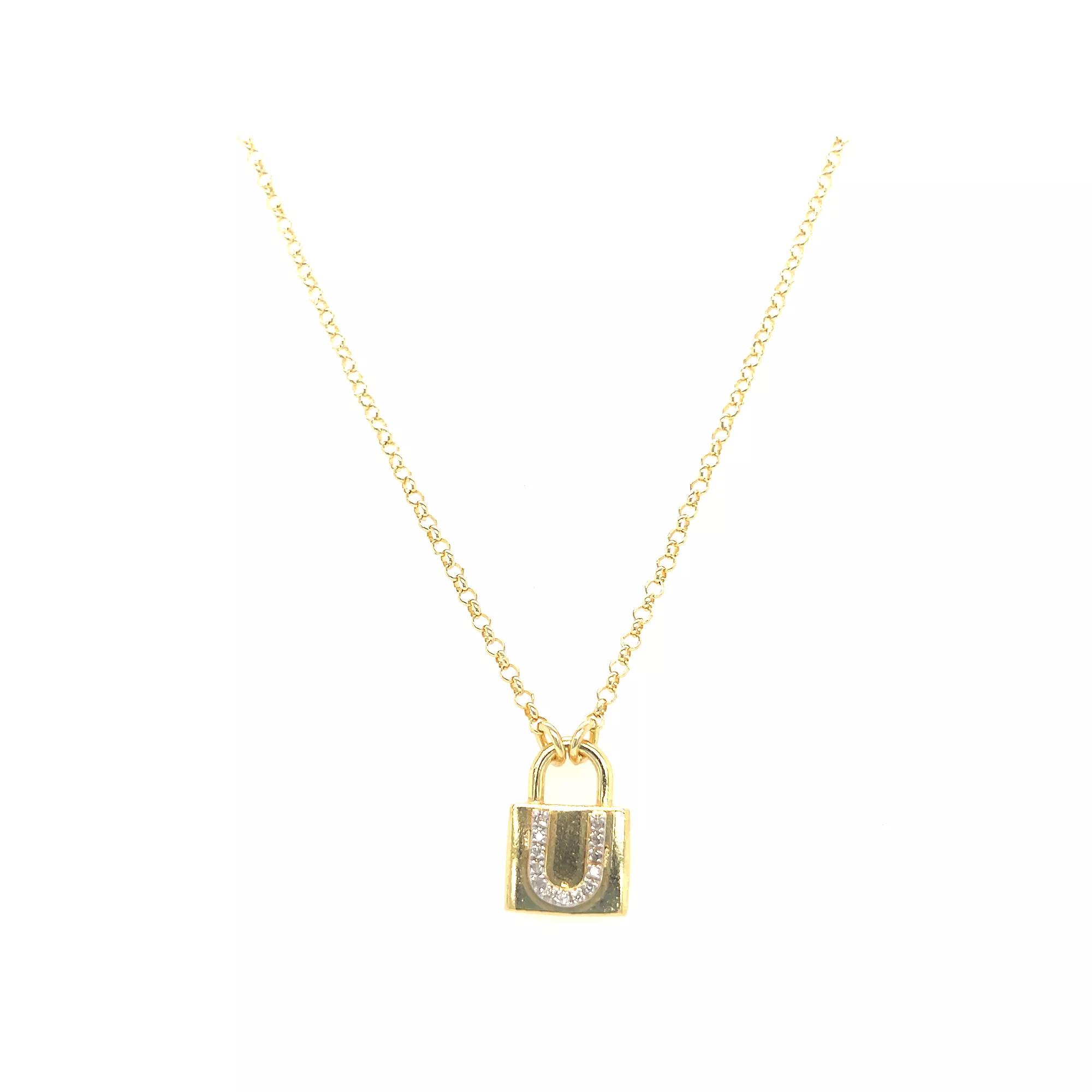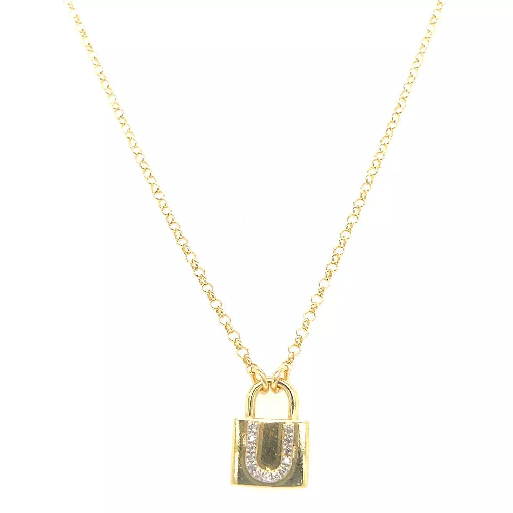 This 14k gold over silver padlock initial necklace sparkles with diamond details, creating a graceful and personal design. Click on this JEWELRY & WATCHES GUIDE to learn about fit, styles, materials and more! This 14k gold over silver padlock initial necklace sparkles with diamond details, creating a graceful and personal design. Click on this JEWELRY & WATCHES GUIDE to learn about fit, styles, materials and more! FEATURES Chain length: 16 in. + 2-in. extender Chain type: link Clasp: lobster-claw Metal: sterling silver Plating: 18k gold Finish: polished Packaging: boxed Nickel free ImportedDIAMOND DETAILS Total weight: 1/8 ct. Color grade: G-H Clarity: SI1-2 Shape: round Setting: prong Diamond weights are approximate. Diamond Total Weights may vary between .01 and .13 ct. Some diamonds consist of fewer than 17 facets. Gemstones may have been treated to enhance their appearance. Special care may be required. Please visit our Gemstone Treatment & Special Care Guide for more information. Image(s) may be enlarged to show detail. Size: 16-18" ADJ. Color: Gold Tone U. Gender: female. Age Group: adult. Material: Gold Plate.