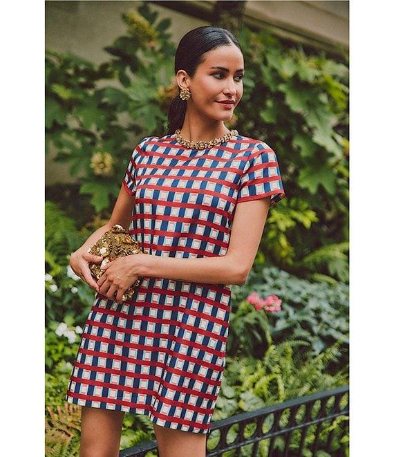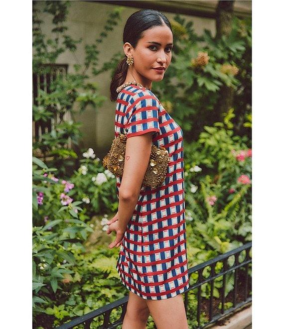 From Mestiza New York, this dress features: Woven fabrication Shift silhouette Gingham print Round neckline with jeweled detail Short sleeves Straight hem Back zip closure Approx. 33" length with 2" seam allowance Polyester/spandex Dry clean Imported.