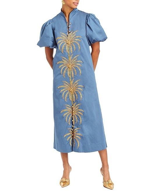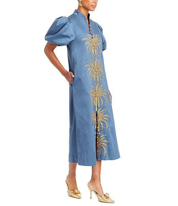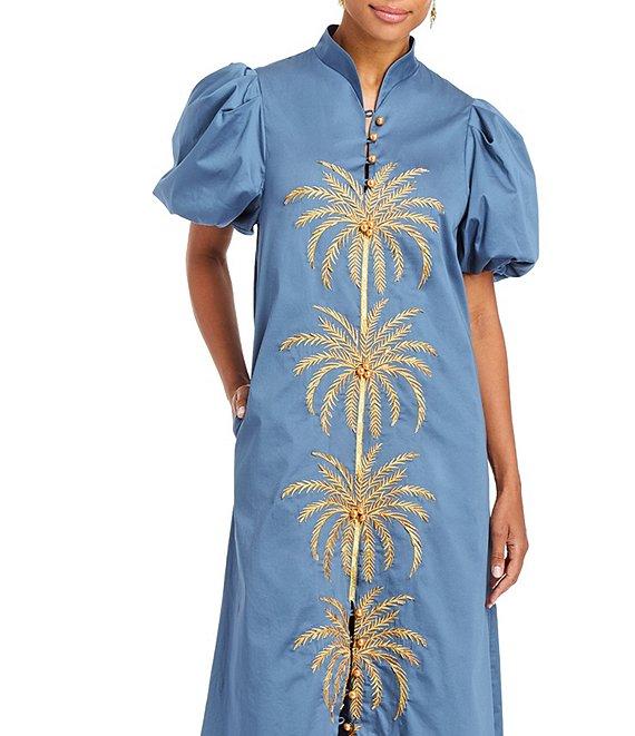 From Mestiza New York, this dress features: Lightweight poplin fabrication Shift silhouette Palm tree embroidery Mandarin collar neckline Short puff sleeves Side seam pockets Straight hem Gold button detail Button front closure Approx. 50" length Cotton/spandex Dry clean Imported.