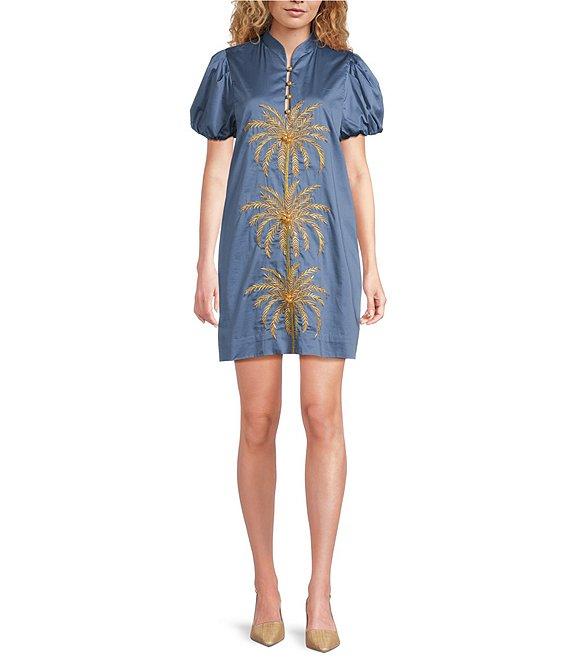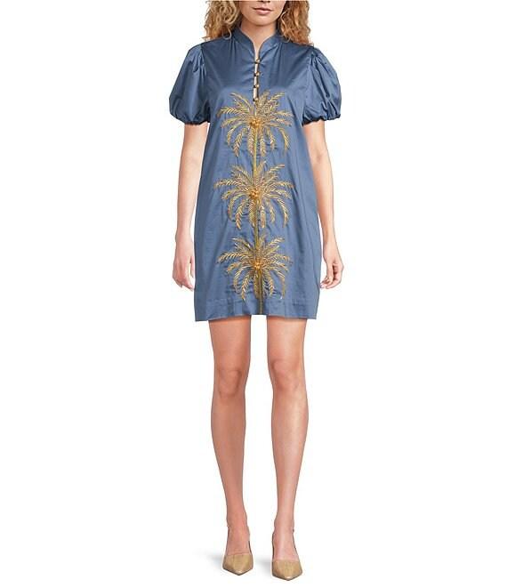 From Mestiza New York, this dress features: Lightweight poplin fabrication Shift silhouette Mandarin collar neckline Short puff sleeves Palm tree embroidery Side seam pockets Straight hem Gold button detail Button front closure Approx. 34" length Cotton/spandex; lining: cotton; shoulder insert: polyester Dry clean Imported.