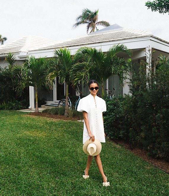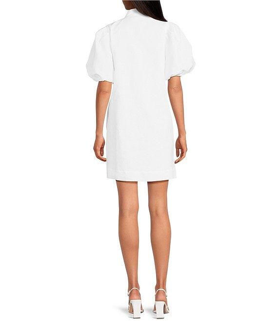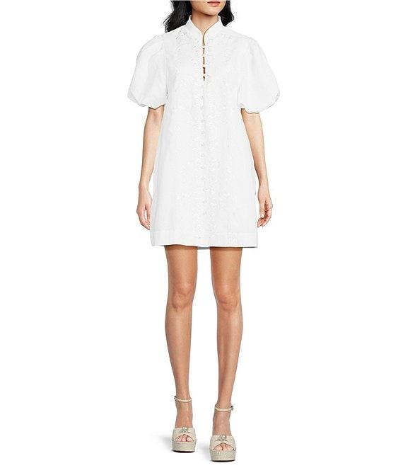 From Mestiza New York, this dress features: Linen blend fabrication Mandarin collar with adjustable pearlized button closure Elasticized puff sleeves Heritage-inspired embroidery Side seam pockets Fully lined Straight hemline Button front closure Approx. 34" length Linen/cotton Dry clean Imported.