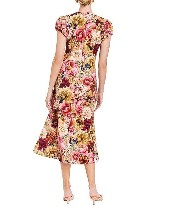From Mestiza New York, this dress features: Stretch crepe fabrication Floral print Round neckline Short puff sleeves Fit and flare silhouette Straight hem Back zip closure Approx. 48.5" length Polyester/spandex Machine wash Imported.