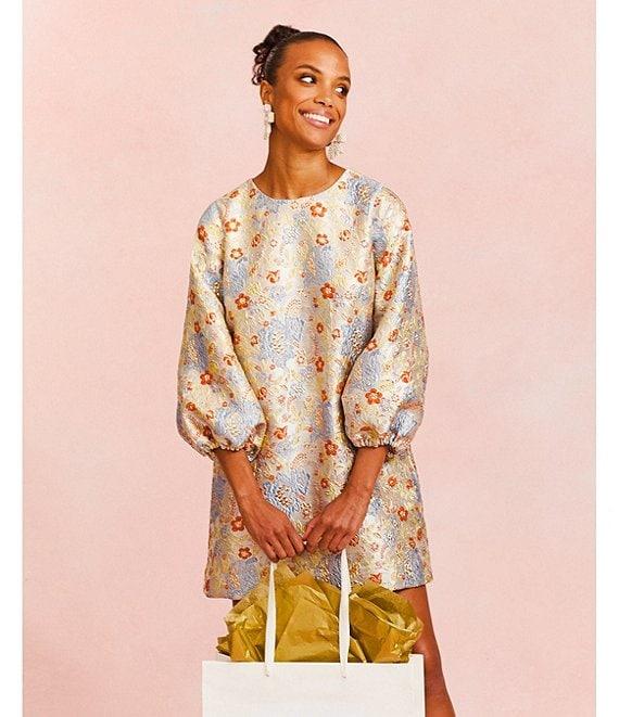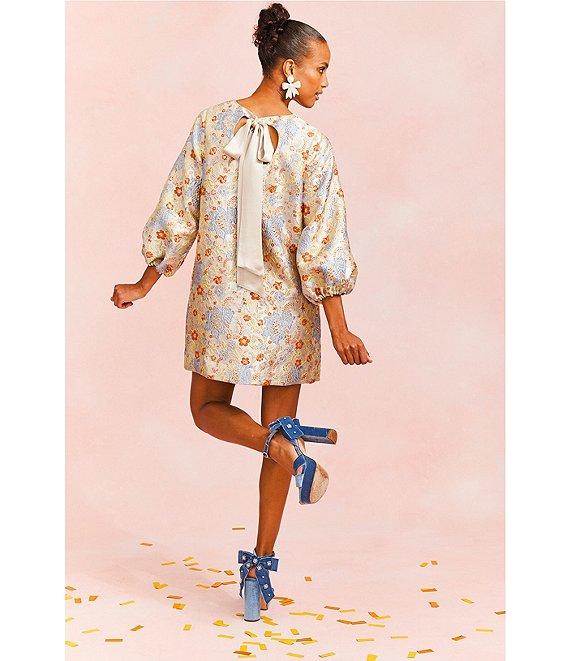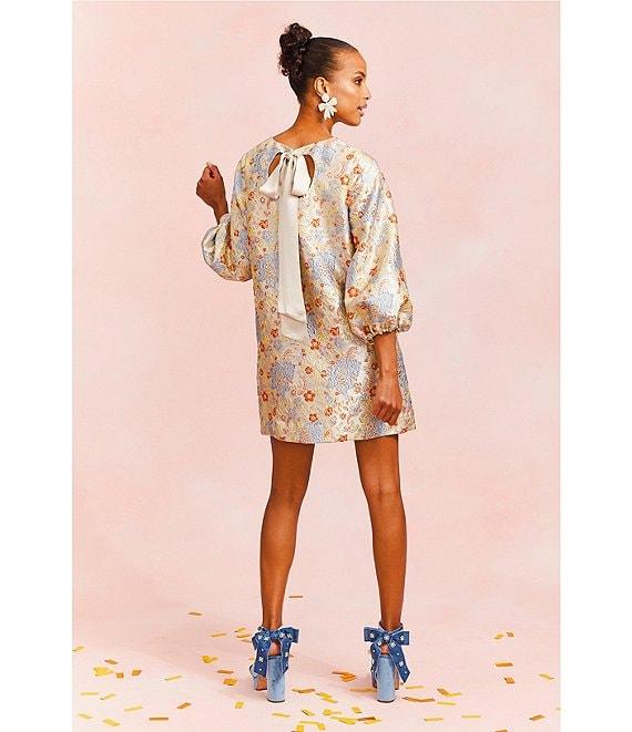 From Mestiza New York, this dress features: Metallic jacquard fabrication Floral print Boat neckline 3/4 balloon sleeves Side slash pockets Lined Straight hem Contrast satin bow back detail Pullover construction Approx. 33.5" length Polyester/nylon/spandex; lining: polyester/spandex Dry clean Imported.