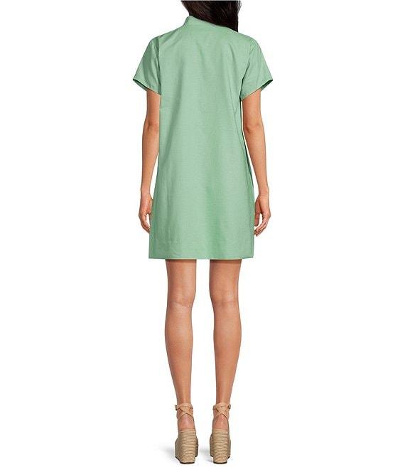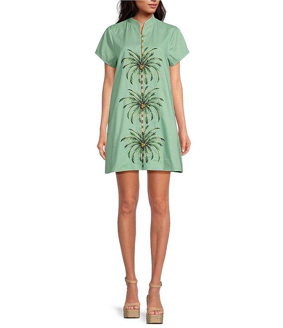 From Mestiza New York, this dress features: Embellished linen blend fabrication Shift silhouette Mandarin collar with adjustable pearlized button closure Short sleeves Palm tree embroidery Side seam pockets Fully lined Straight hemline Button front closure Approx. 34" length Linen/cotton Dry clean Imported.