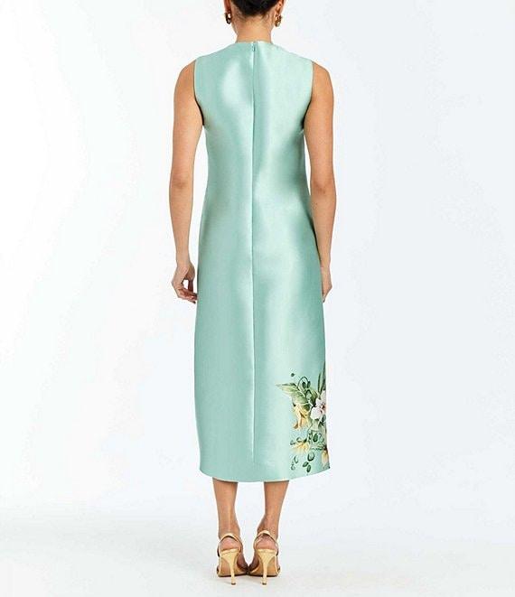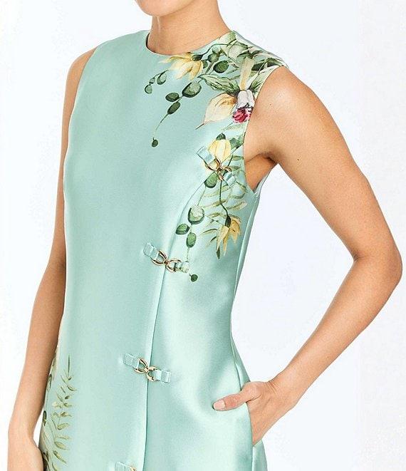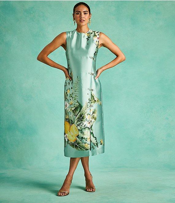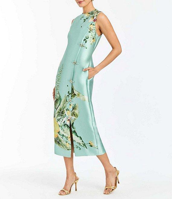 From Mestiza New York, this dress features: Woven fabrication Citron tableau floral print Column silhouette Crew neckline Sleeveless Side slit Gold hardware detail Straight hem Back zip closure Approx. 48" length Polyester/silk Dry clean Imported.