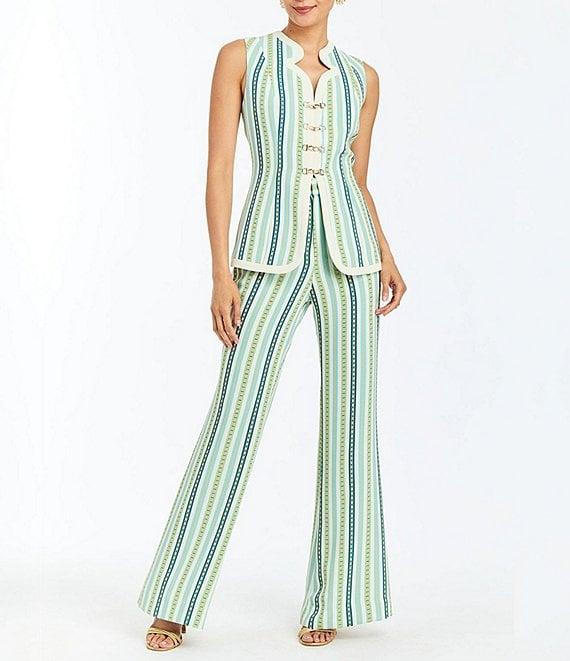 From Mestiza New York, these pants feature: Woven fabrication Catena stripe print Flat front Bell bottom silhouette Side seam/back welt pockets Front-fly zip closure Approx. 42.25" length; 31.25" inseam Polyester Machine wash Imported.