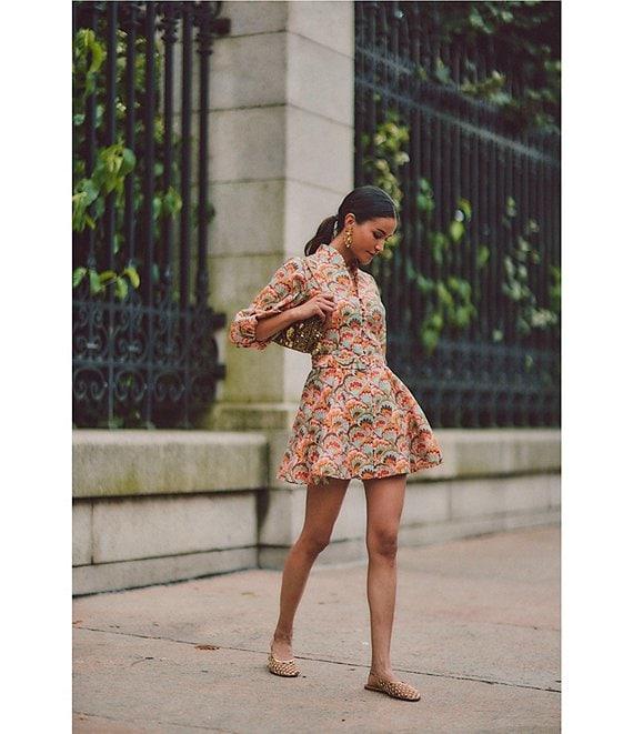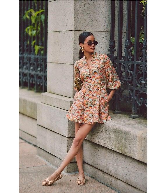 From Mestiza New York, this dress features: Organza fabrication Fit-and-flare silhouette Fan print Mandarin collar neckline Puff elbow sleeves Adjustable belt Side pockets Straight hem Button front closure Approx. 33" length Tencel/polyester Hand wash Imported.