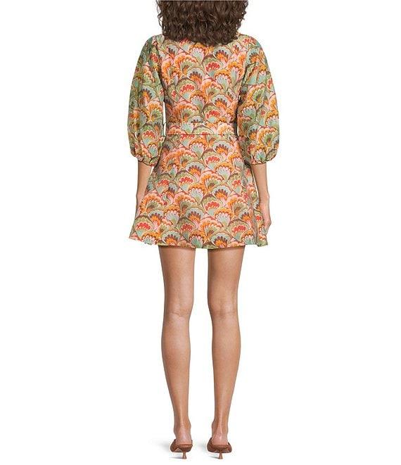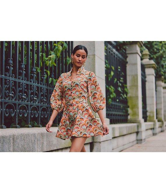Mestiza New York Valencia Organza Fan Print Mandarin Collar Elbow Sleeve Dress