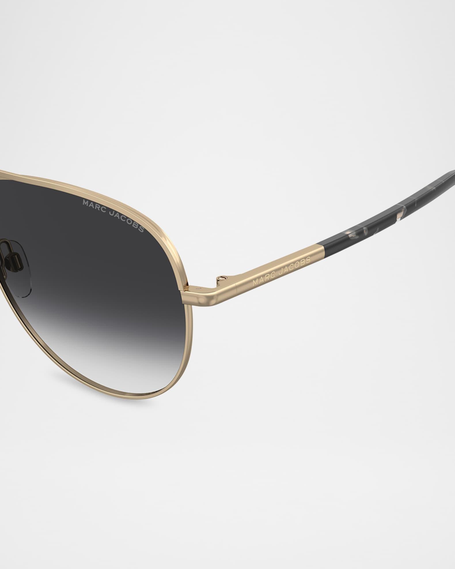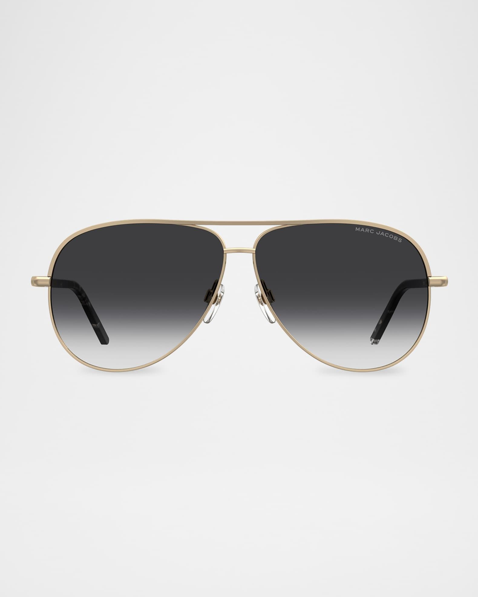 Marc Jacobs "Marc 765S" aviator sunglasses in metal Lens/bridge/temple (in mm): 61-10-145 Gradient lenses; logo on corner Double nose bridge Adjustable nose pads Logo-embossed temples Thin, tapered arms Metal Wipe clean 100% UVA/UVB protection Imported Proposition 65 warning for California residents