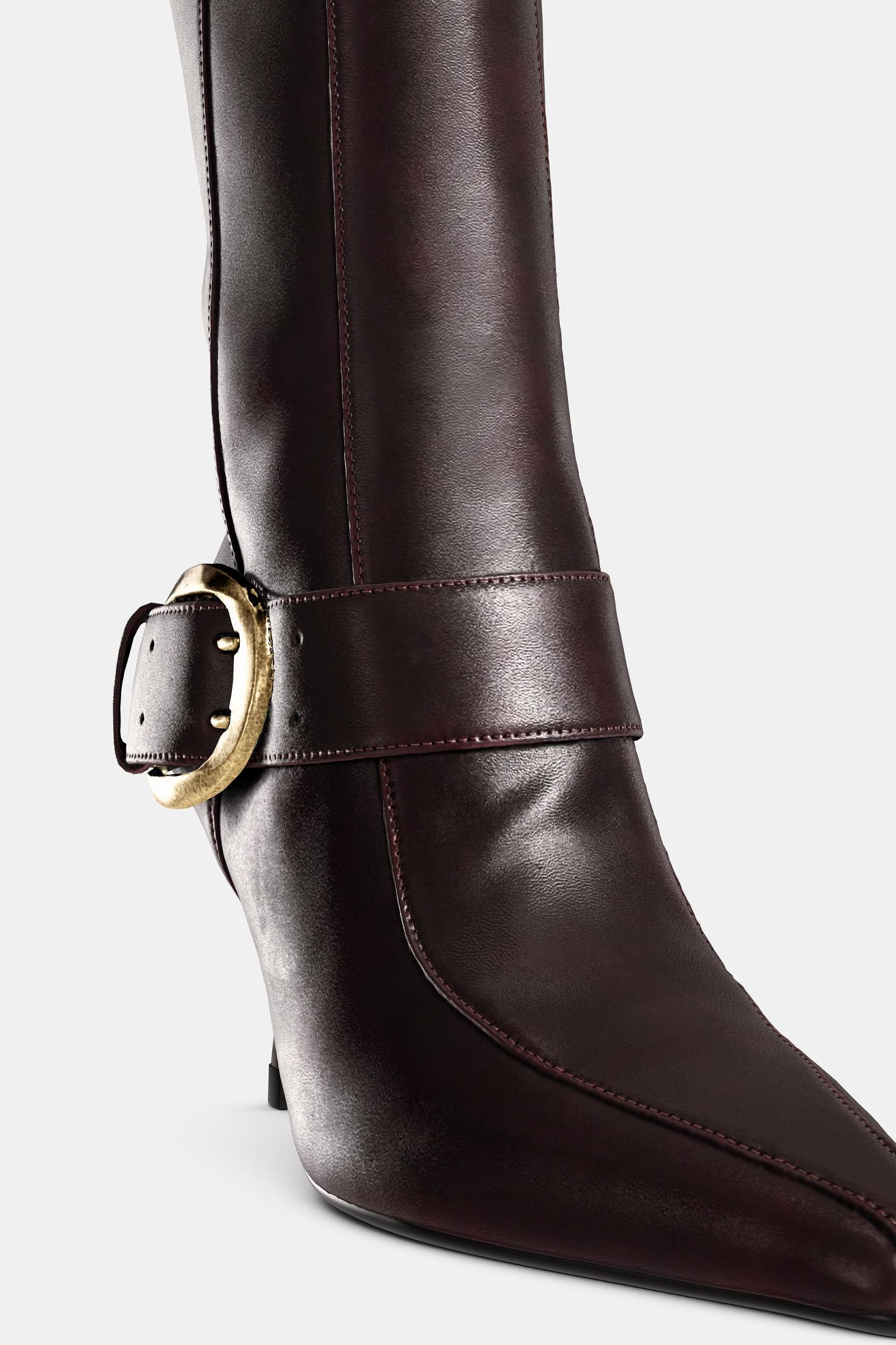 High-shaft boots. Topstitching detail on the body. Wide strap with metal buckle at the side. Zip closure with pull tab. Stiletto high heel. Pointed toe. Heel height: 3.1 inches (8 cm)