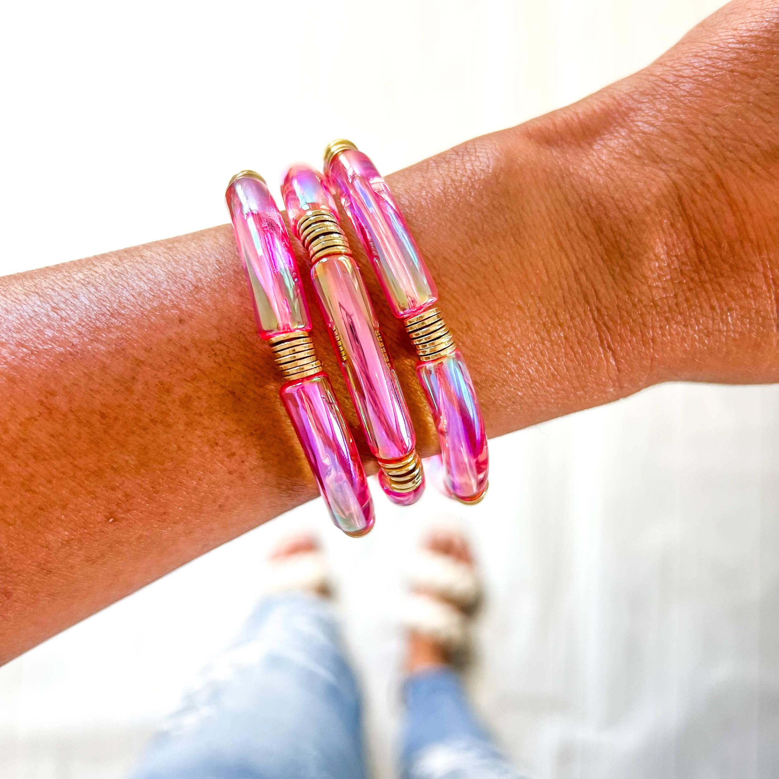 Our Acrylic Tube Bamboo Bracelets are the perfect fun statement bracelet. You can mix and match with other acrylic tube bamboo bracelets or any of our other bracelet styles to make unique pieces.