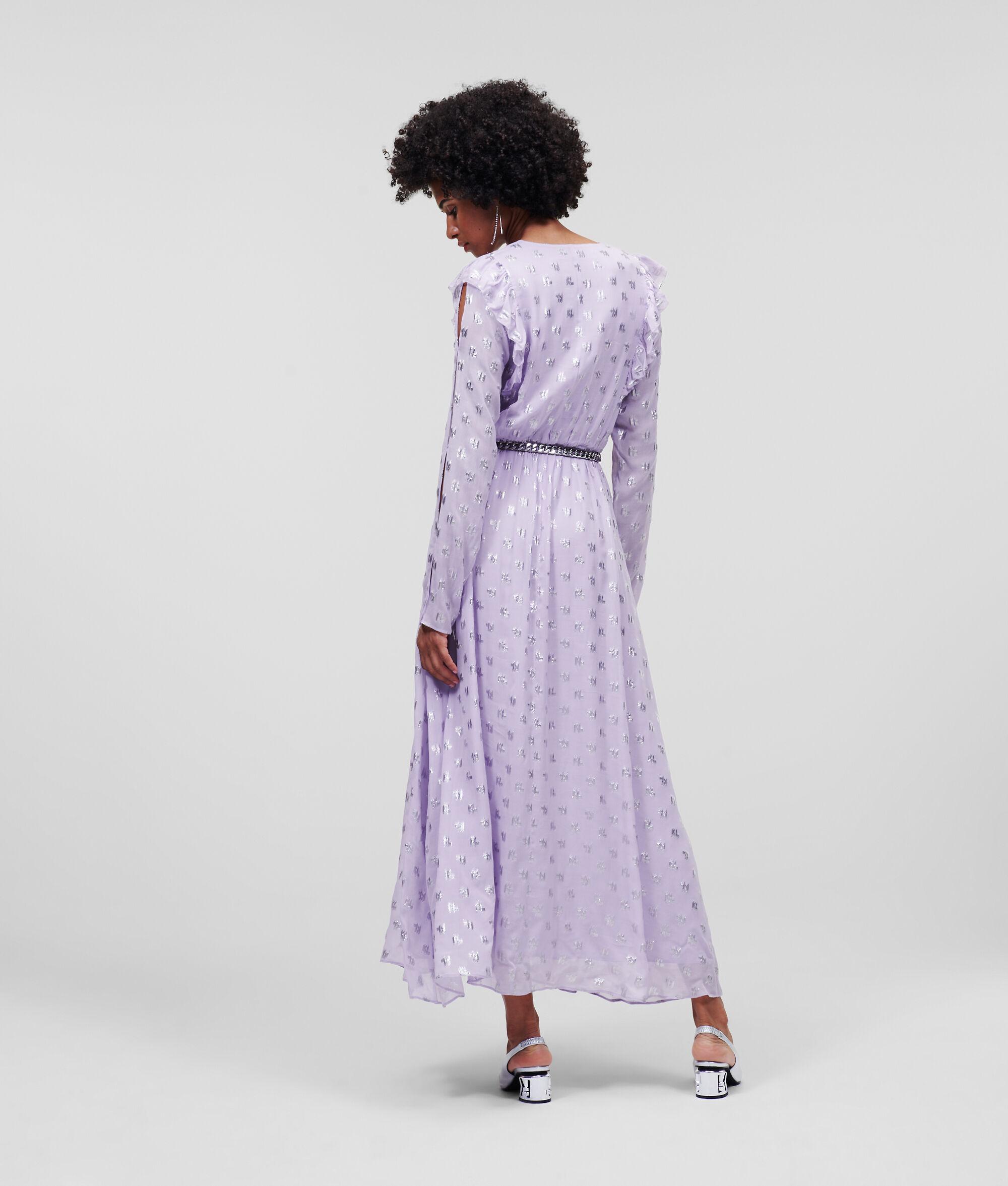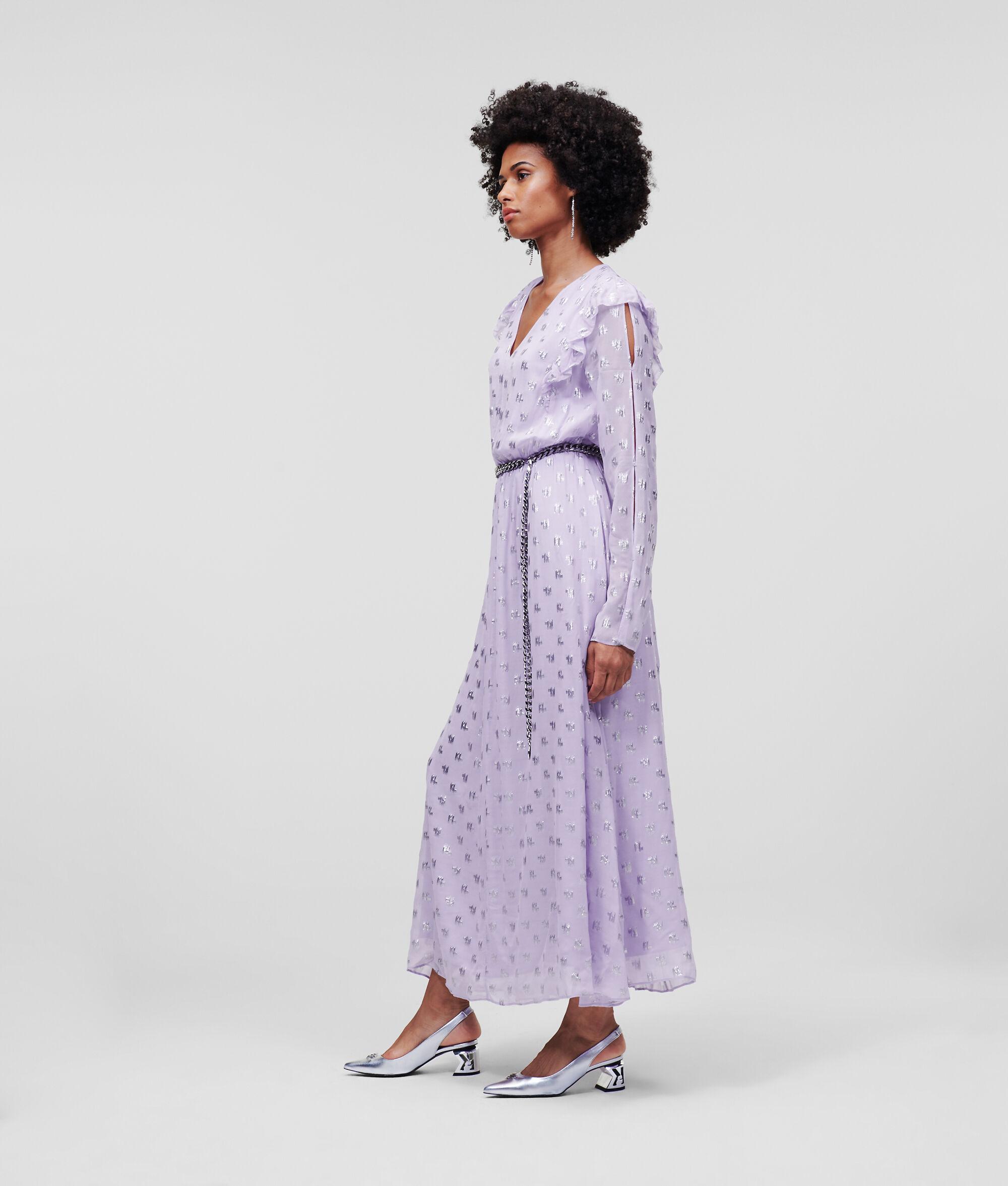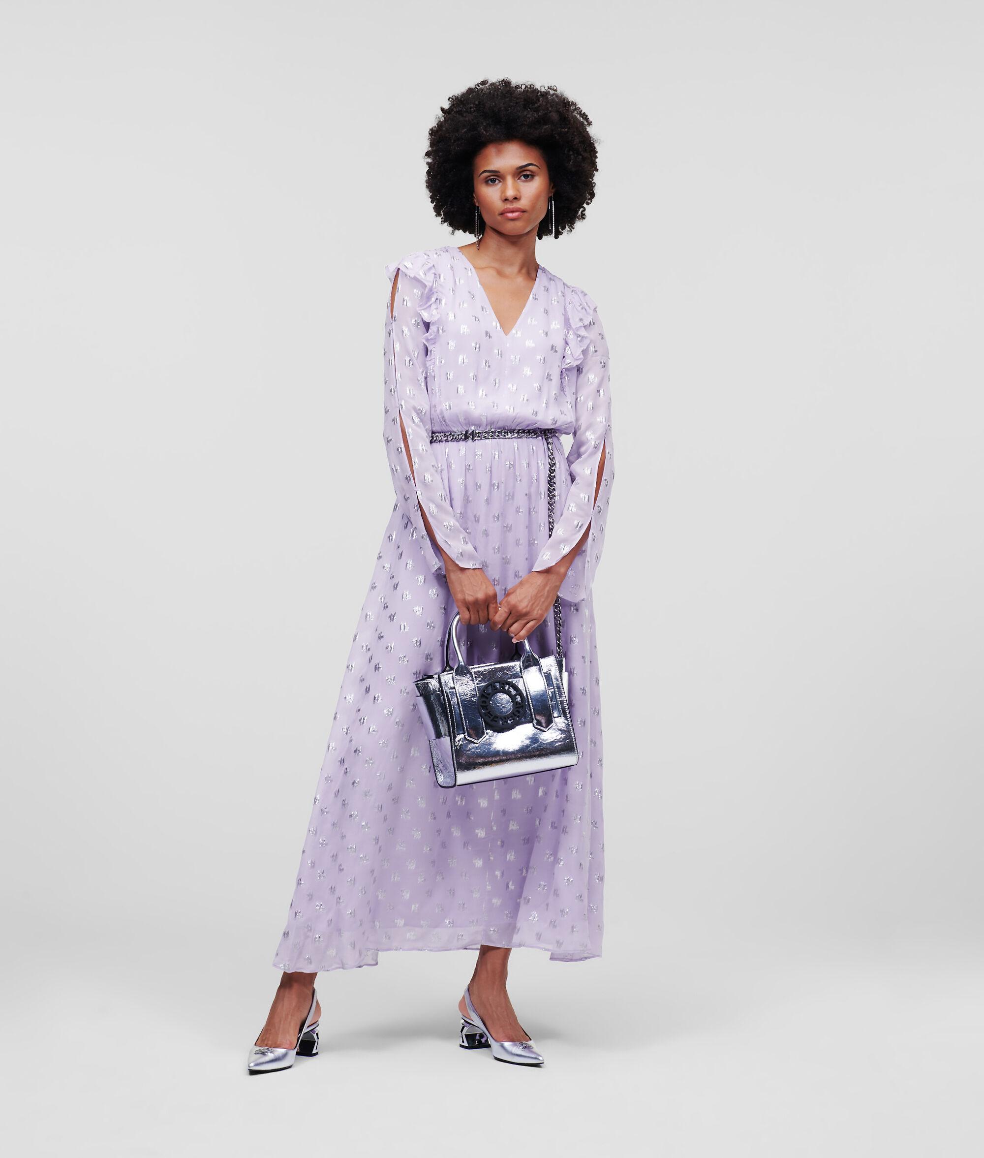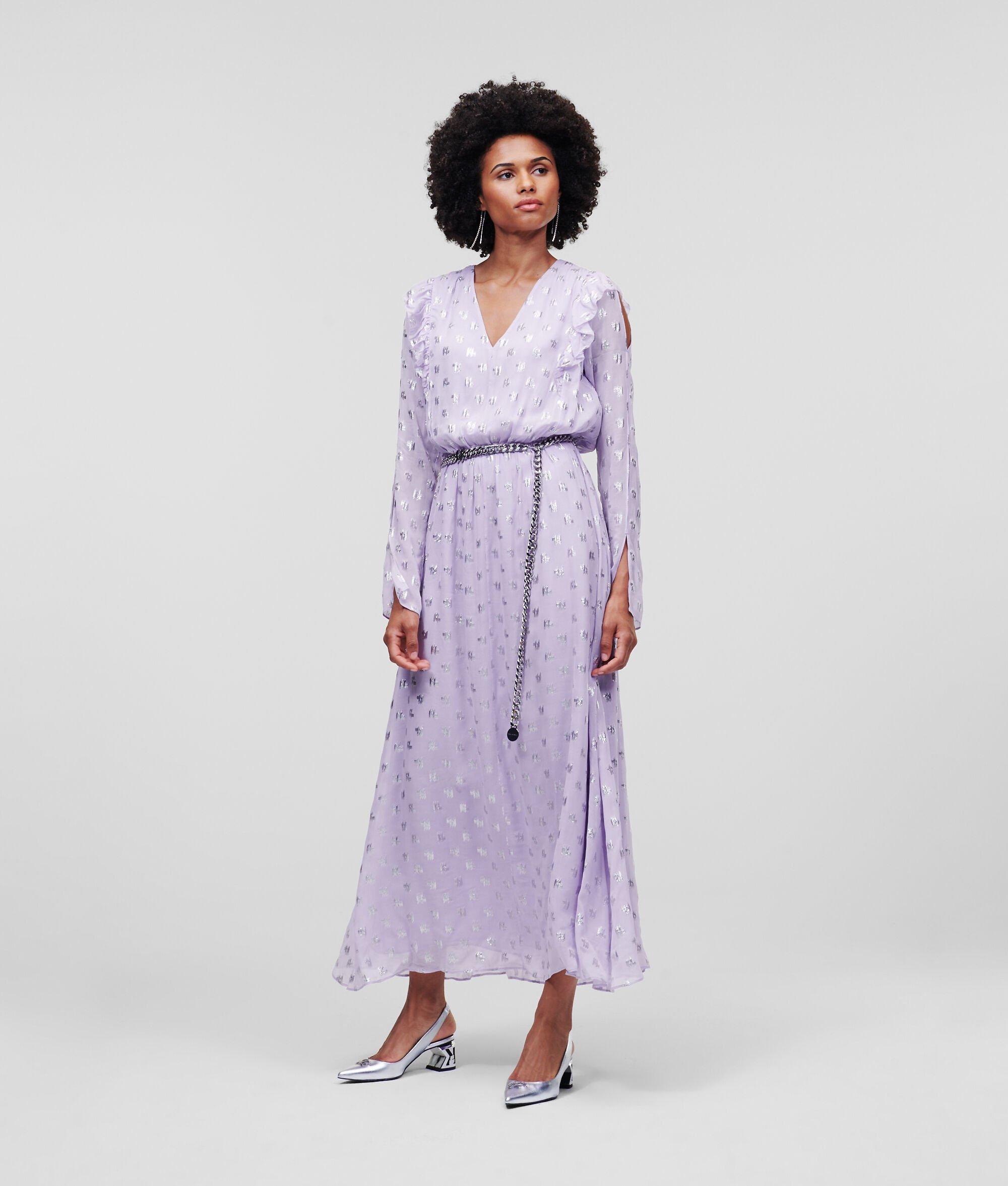 Crafted in a maxi silhouette with a striking KL monogram design and a light-reflecting metallic finish, this elegant dress is an eveningwear must-have The V-neckline, cascading ruffles at the chest and subtle openings at the shoulders accentuate the feminine appeal of this dazzling piece.
