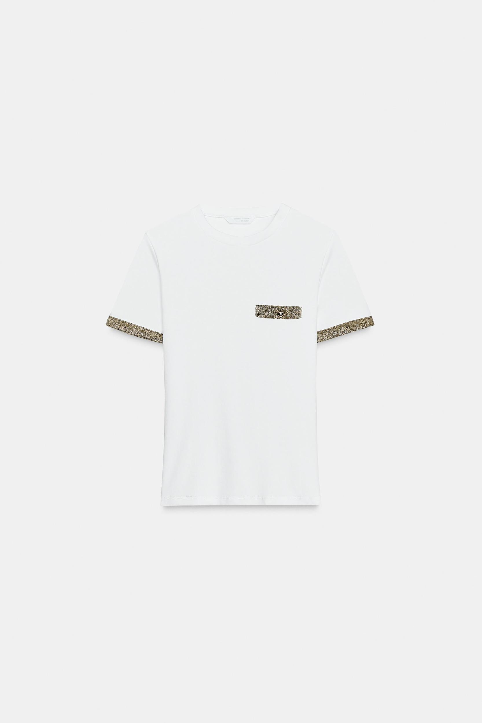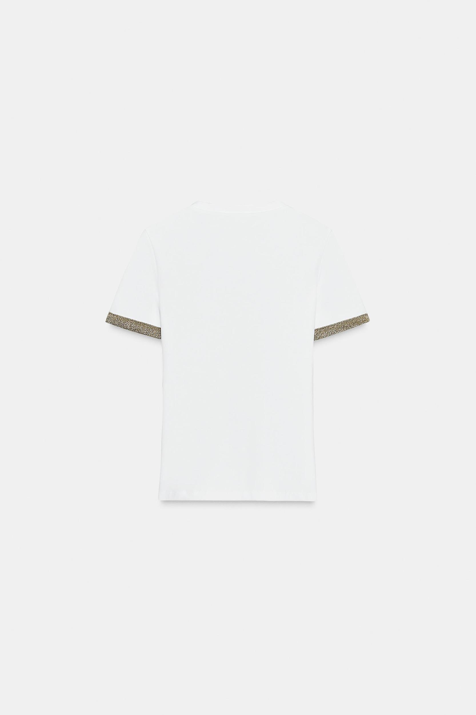 SLIM FIT - ROUND NECK - REGULAR LENGTH - SHORT SLEEVE Round neck, short sleeve T-shirt. Knit trim detail with metallic thread.