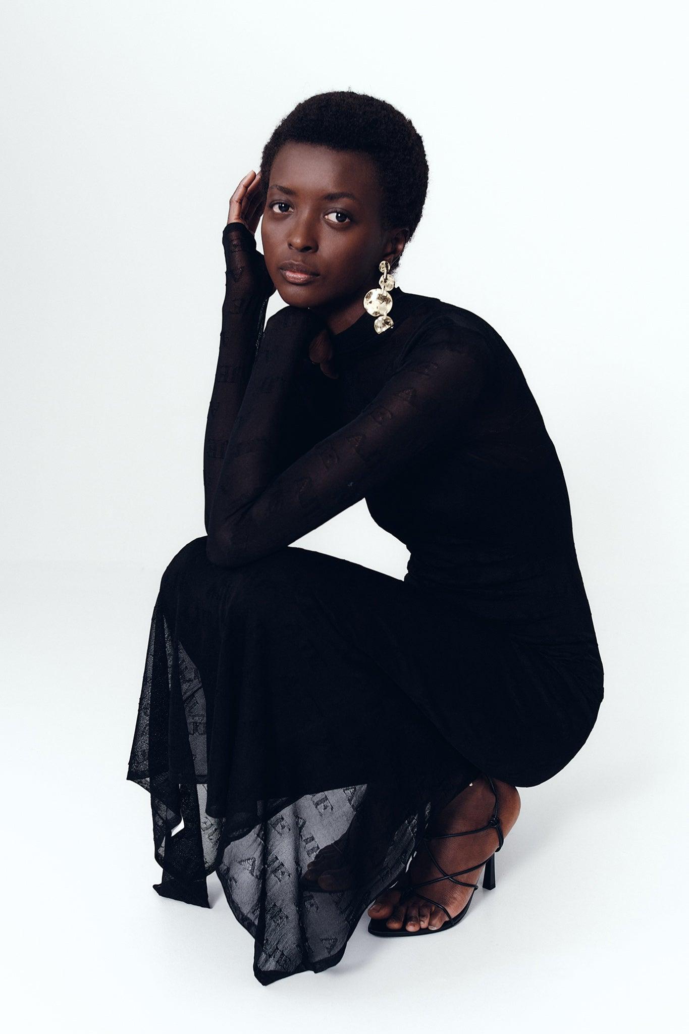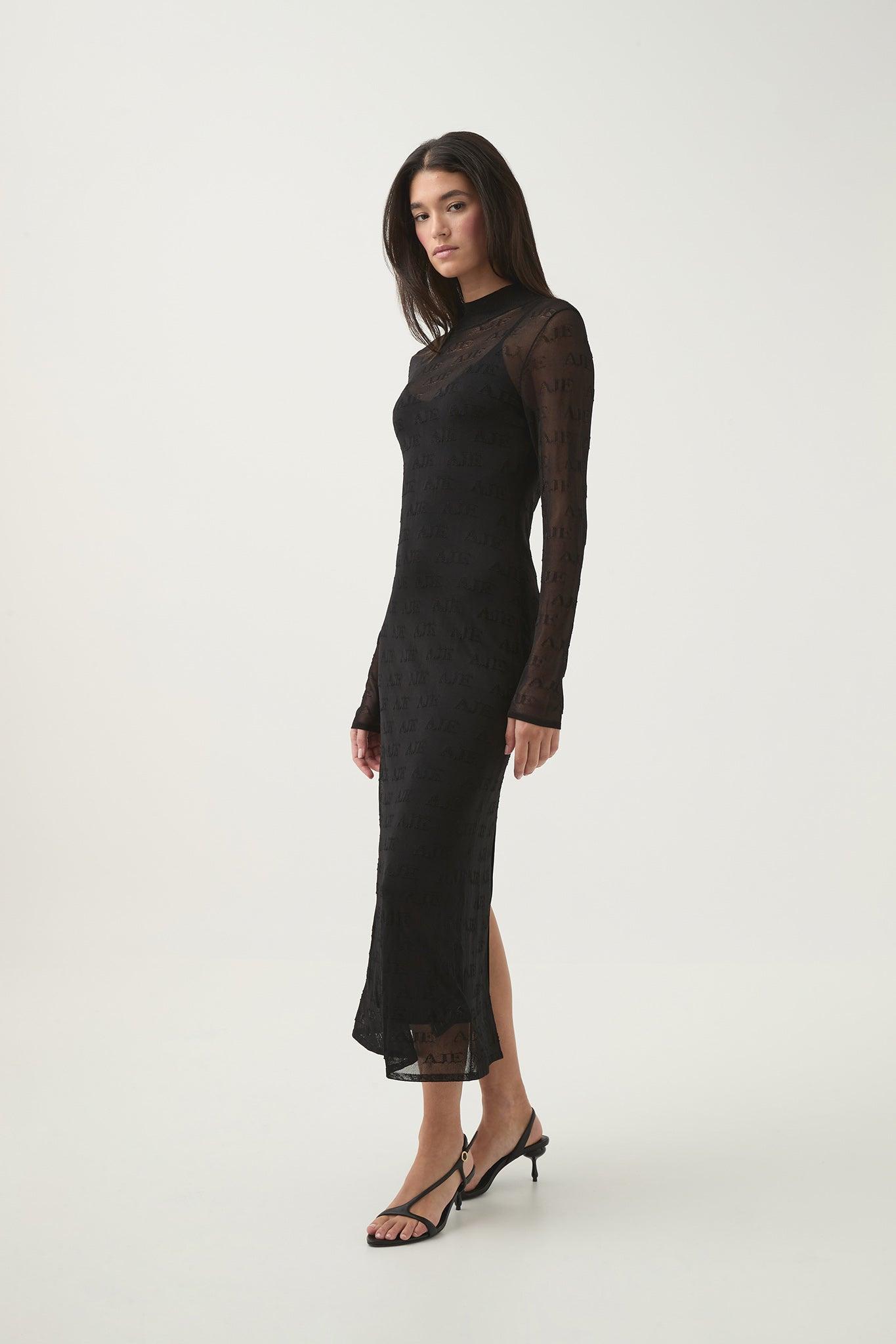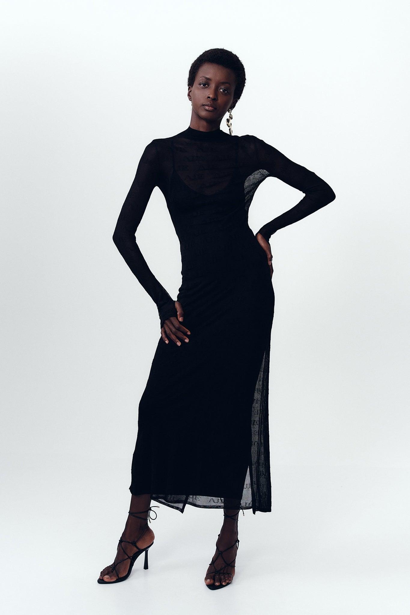 PRODUCT DETAILS Women’s knitted maxi dress Fitted style Sheer finish Detachable bias cut slip Logo detail throughout Ribbed turtleneck Long sleeves Centre back ...