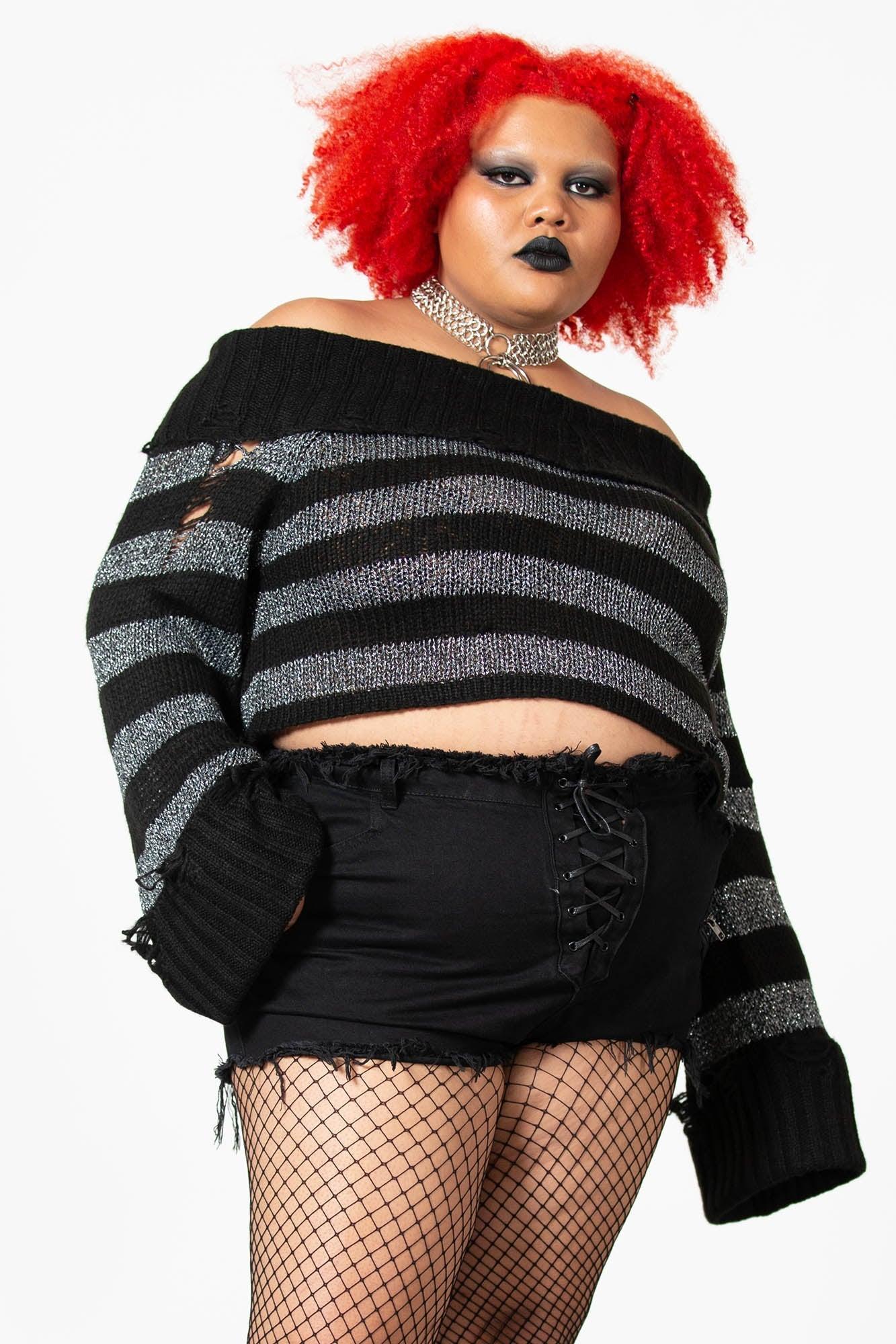 METEOR.- Soft, stretch knit.- Statement metallic knit stripes.- Bardot neckline.- Long sleeves.- Distressed detailing.- Cropped.- Fitted.Model is 5ft 3 and wears a size XS.with KILLSTAR branding, 77% Acrylic, 15% Polyester, 8% Metallized fibre.