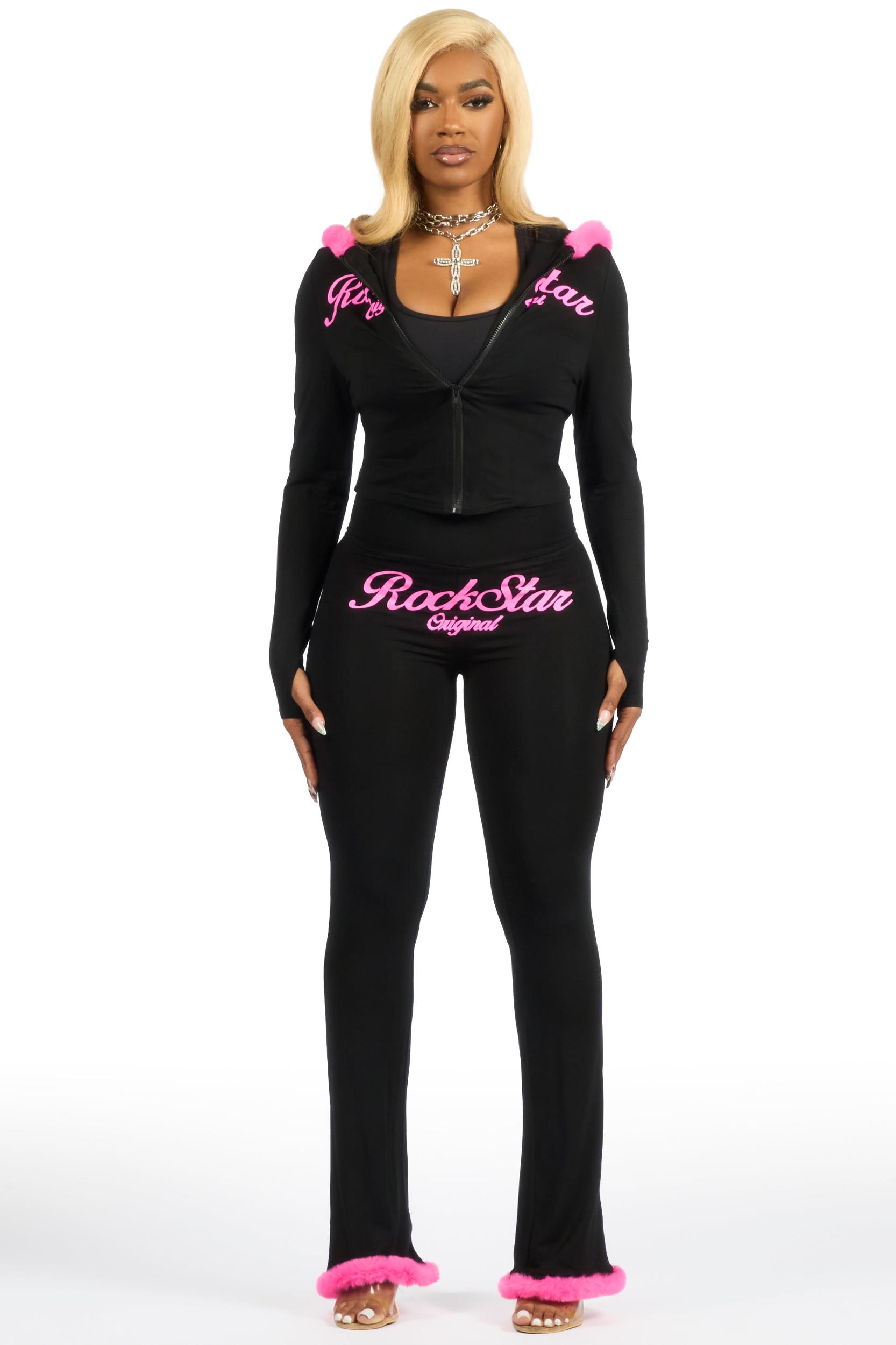An urban athleisure two-piece zip-up jacket and stacked yoga pant set for women. Designed with lightweight fabric for the perfect active lounge set. Fur trim hood Long sleeves Thumb holes Full front zip closure Regular-fit Elasticized waistband Slim-fit Custom RSO graphics Custom fur detailing Flare leg openings 46" inseams