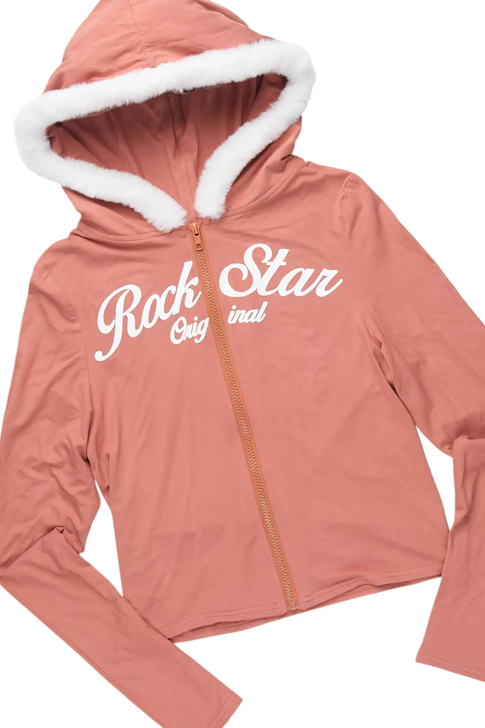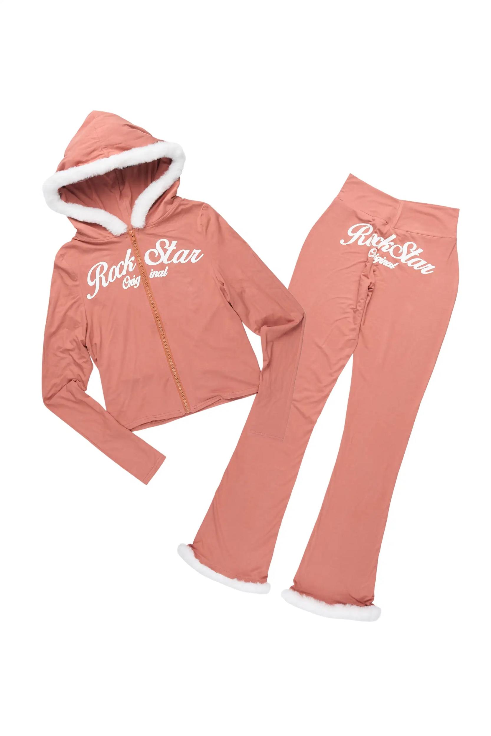 An urban athleisure two-piece zip-up jacket and stacked yoga pant set for women. Designed with lightweight fabric for the perfect active lounge set. Fur trim hood Long sleeves Thumb holes Full front zip closure Regular-fit Elasticized waistband Slim-fit Custom RSO graphics Custom fur detailing Flare leg openings 46" inseams