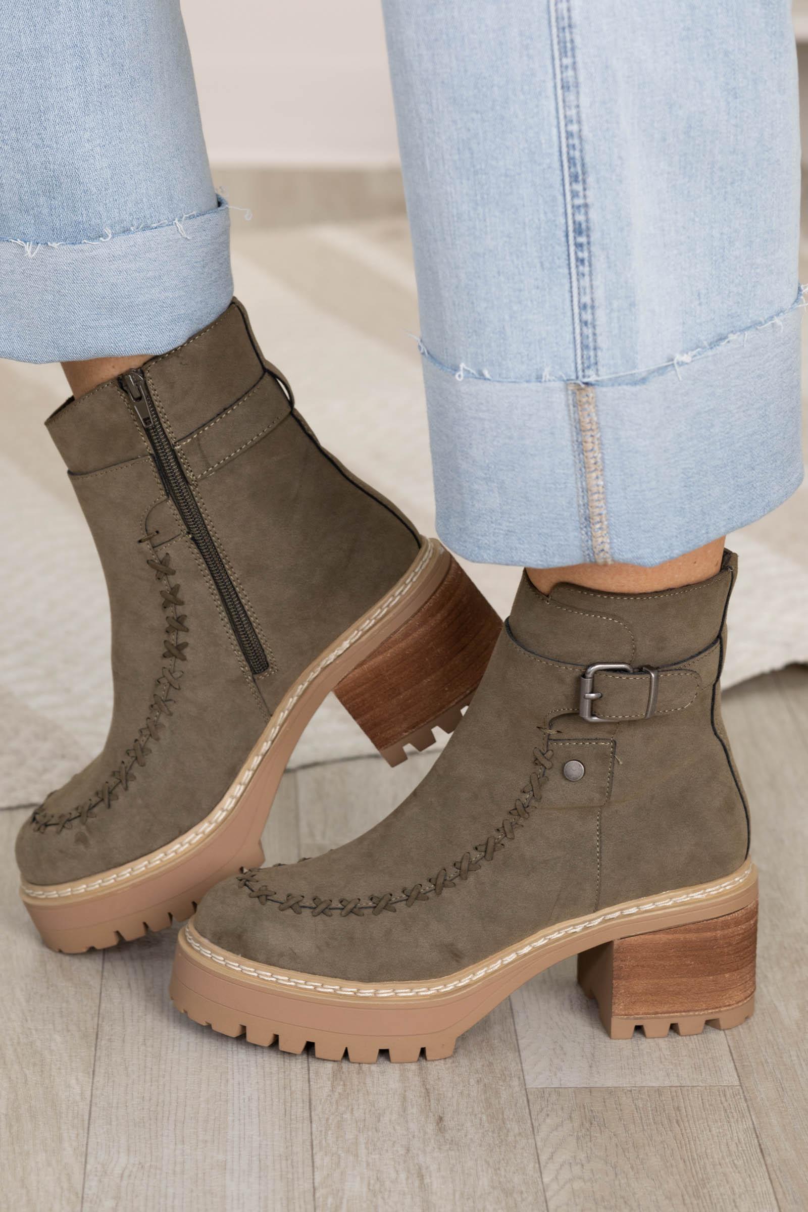 Details: Fashion-Forward + Super Comfortable! Style: Ankle Bootie Heel: 2.25" Heel (Chunk Heel w/Treads) Colors: Khaki, Tan, Gunmetal Print: Solid with Stitching Details Texture: Faux Suede Zipper: Functional Zipper on Inside Brand: MIA Our Team Size Recommendation: We recommend true to size! These boots are a fun, supportive staple that offer ultimate comfort. Wide foot approved.
