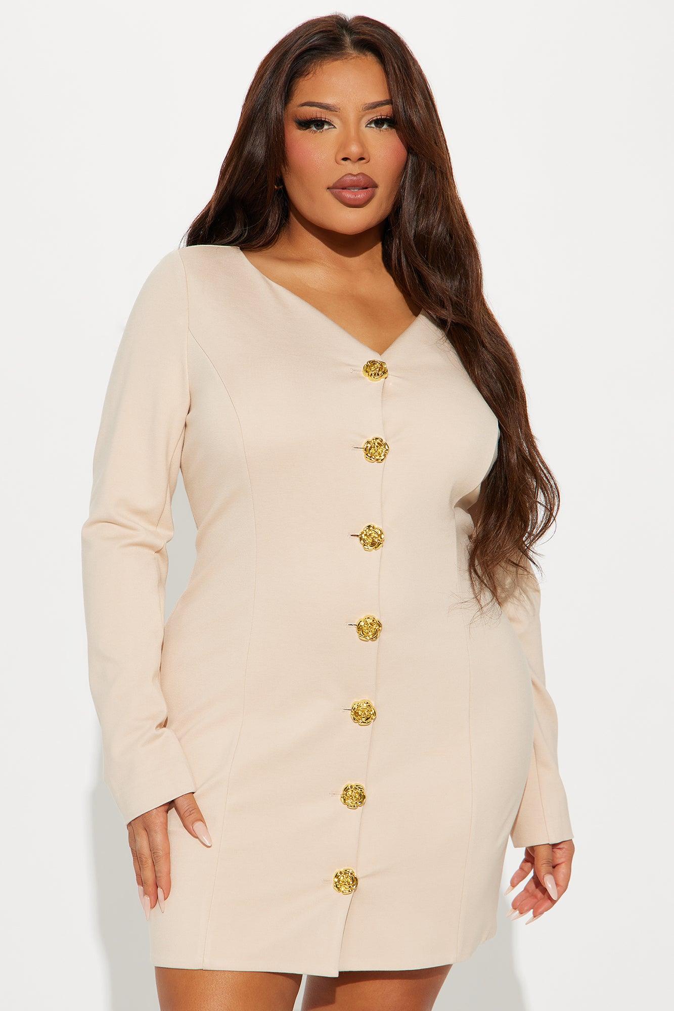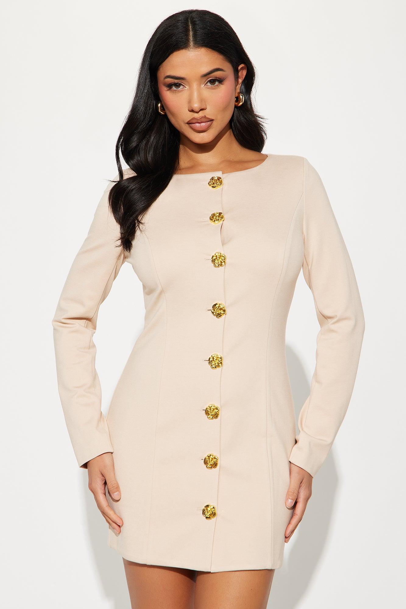 Available In Red And Taupe. Ponte Mini Dress High neckline Long sleeves Button up Double lined Stretch Length measured flat = 32" Self: 63% Rayon 32% Nylon 5% Spandex Lining: 100% Polyester Imported California Proposition 65WARNING: Cancer and Reproductive Harm - www.P65Warnings.ca.gov.