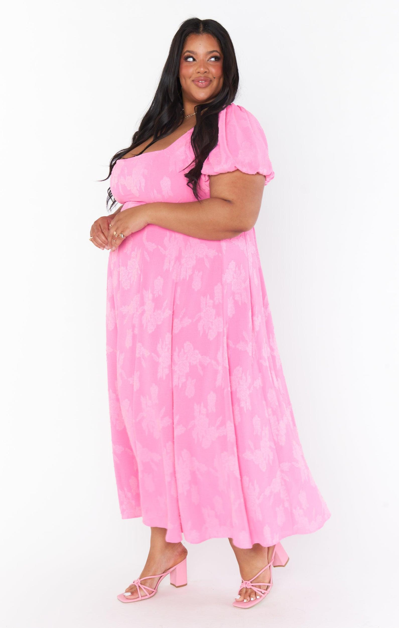 The loveliest mademoiselle in the pink floral Mia Midi Dress. This sweet flowy midi features poof sleeves and a princess seamed bodice with a smocked back. An easy one-and-done look styled with heeled sandals and gold jewelry. SIZE UP: We recommend sizing up for more room in the bust