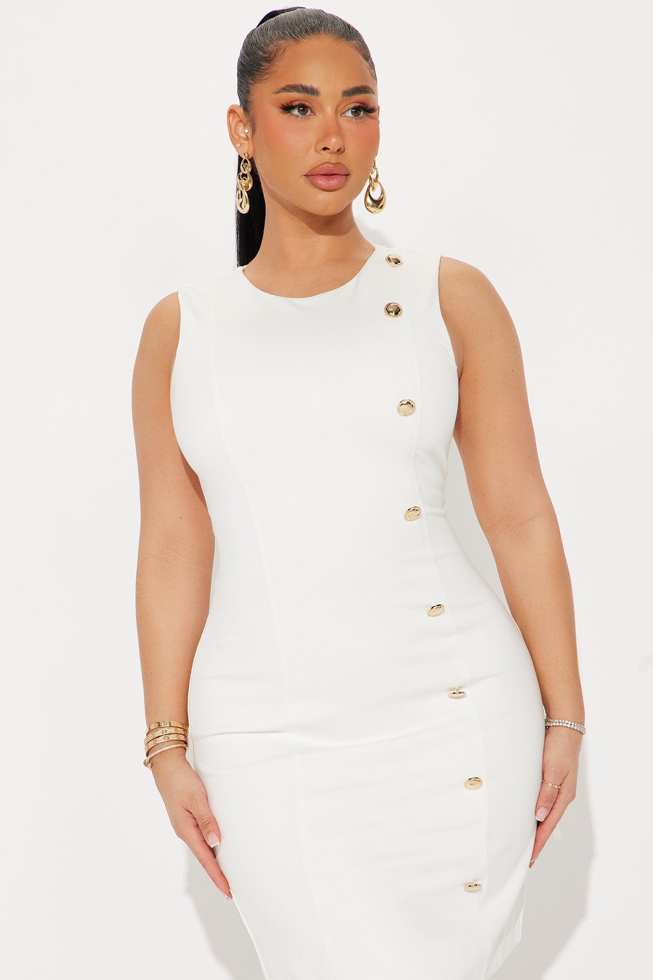 Available In Off White. Ponte Midi Dress High neckline Sleeveless Faux buttons Back zipper Double lined Stretch Length measured flat = 37" Self / Lining 63% Rayon 32% Nylon 5% Spandex Imported California Proposition 65WARNING: Cancer and Reproductive Harm - www.P65Warnings.ca.gov.