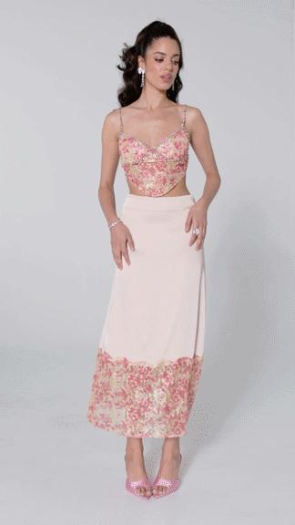 Expand your skirt collection with this fanciful number. The Mia Skirt is made of satin, lace, and pure romance. It hugs your figure and offers a delicate, playful flow. Pair it with the Mia Lace Top for a dreamy outfit that can be worn from day to night. Satin and lace Midi length Dry clean only