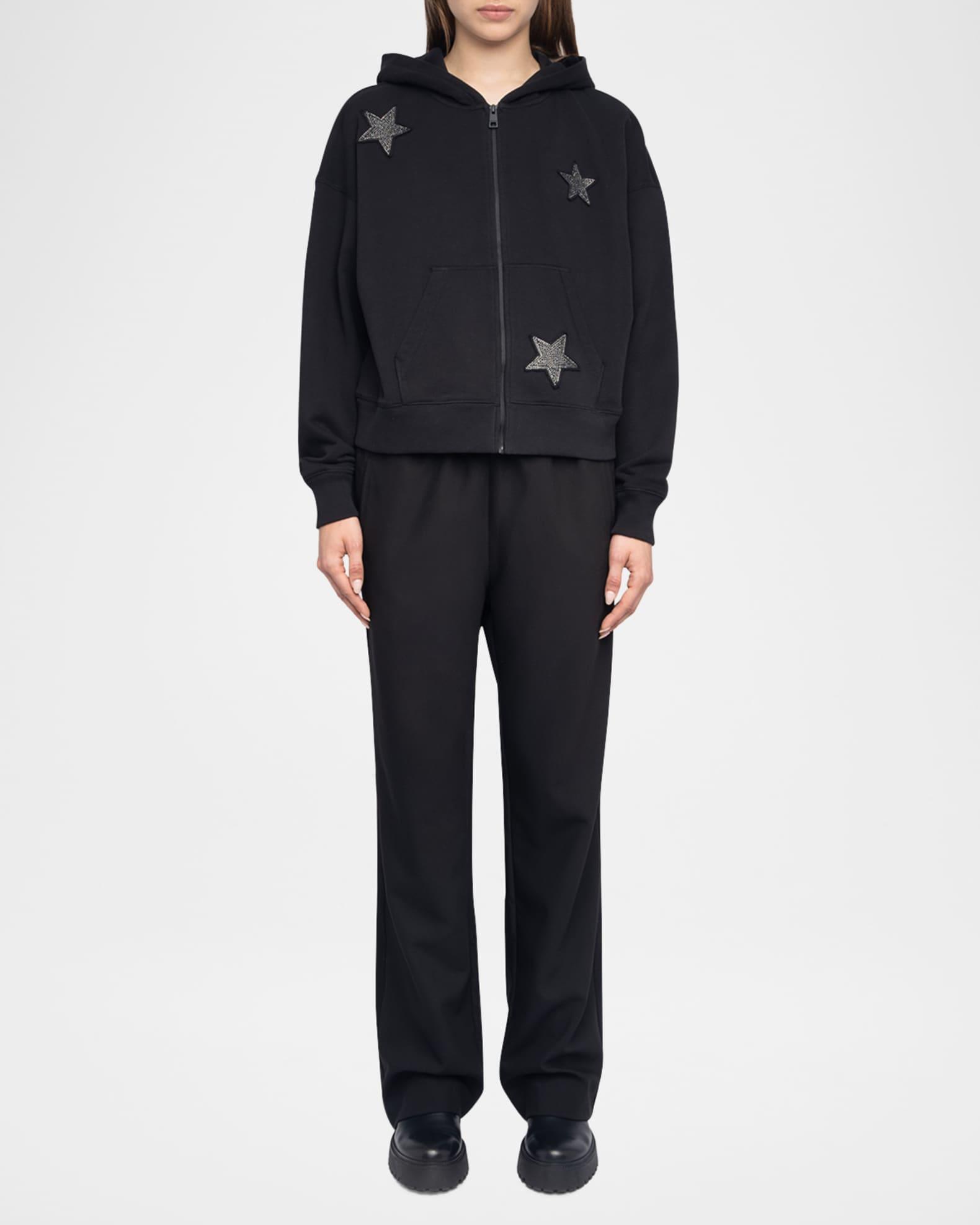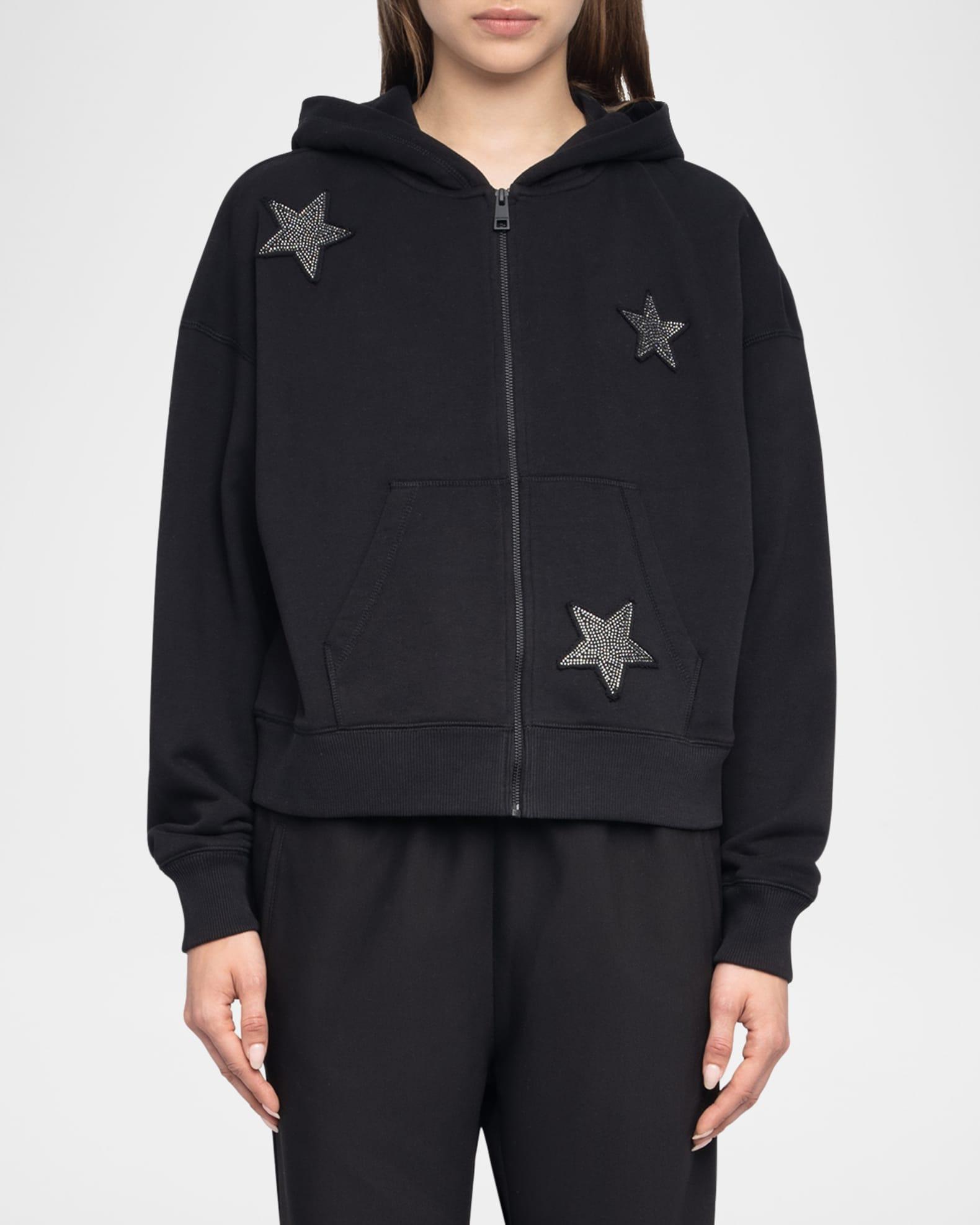 Zadig & Voltaire "Mia" sweat jacket detailed with rhinestone-embellished star patches Hooded neckline; front zip Dropped shoulders Long sleeves; banded cuffs Split kangaroo pocket Relaxed fit Hip length Cotton/polyester Machine wash cold, line dry Imported