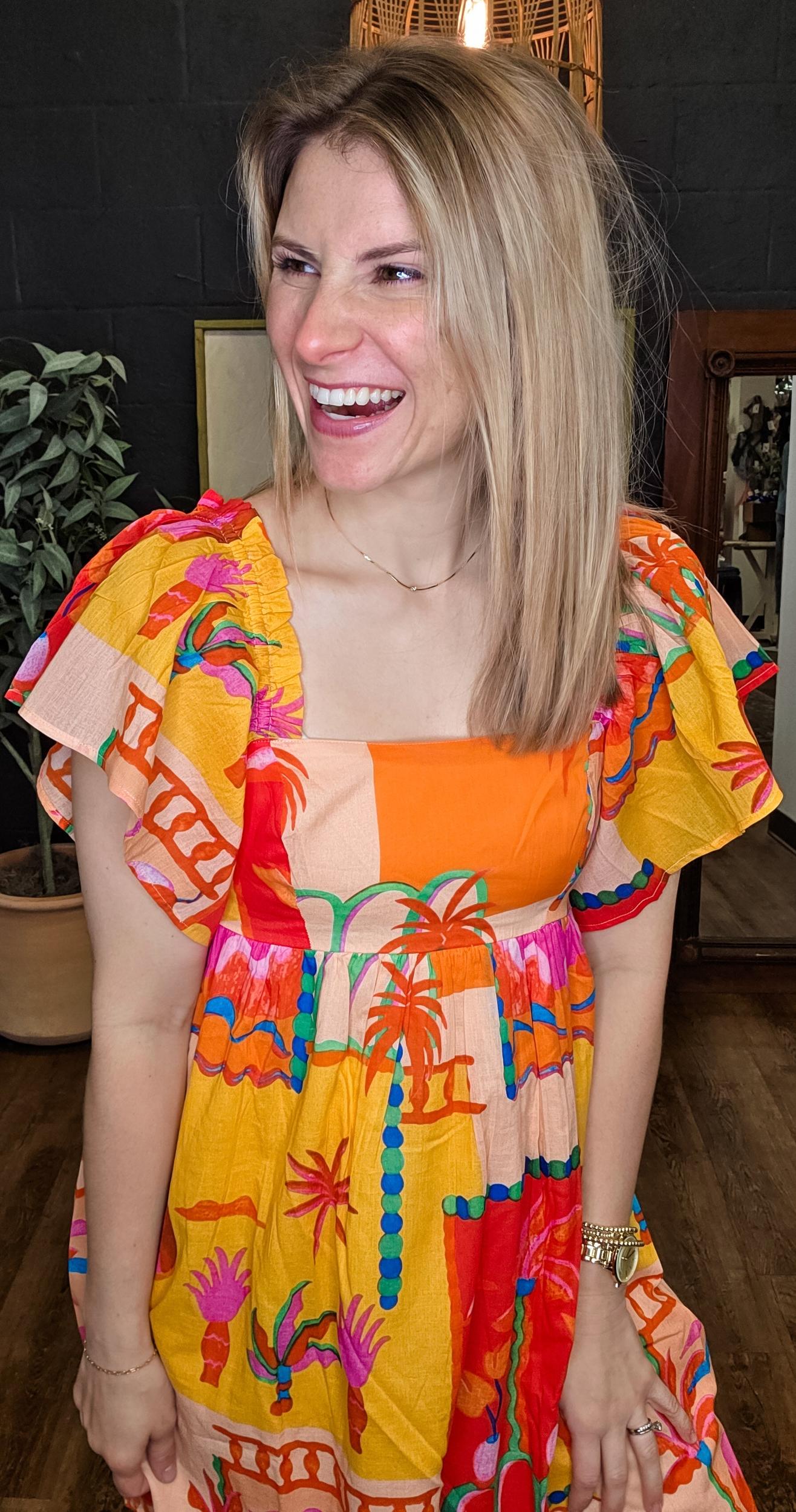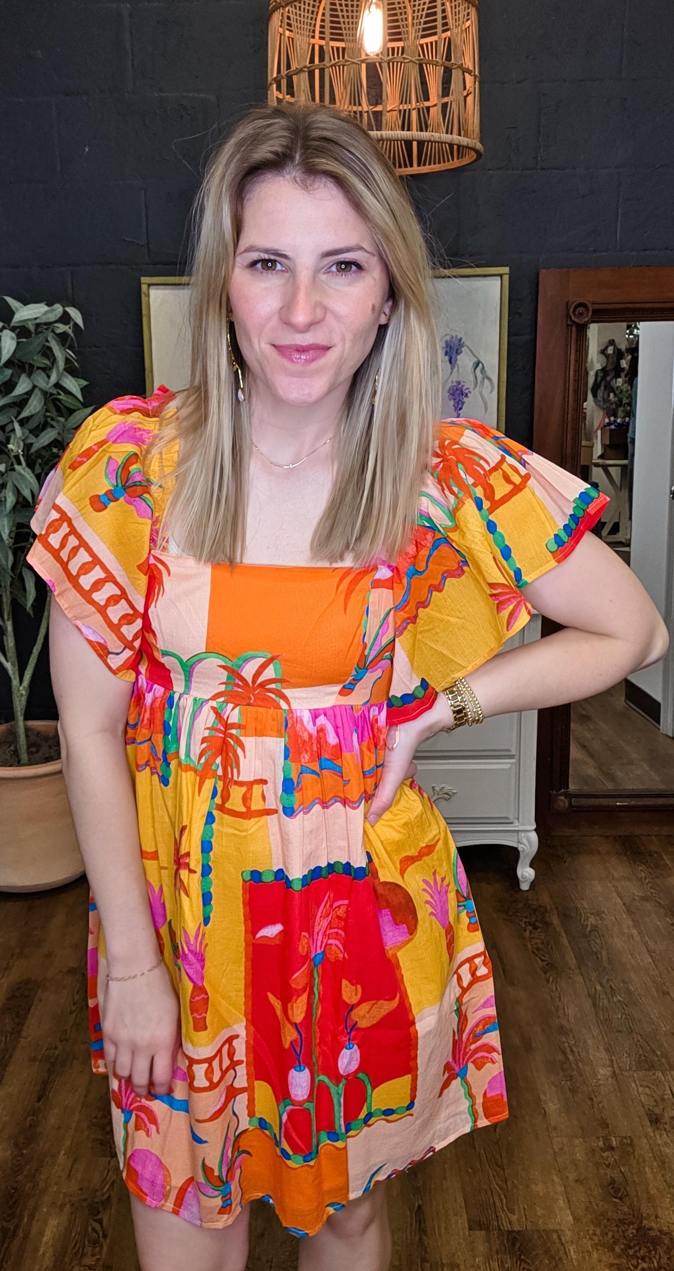 This printed flutter sleeve mini dress is made of 100% cotton, with a cotton lining. Perfect for any warm weather occasion, this dress is a must-have for your wardrobe. The breathable fabric and flutter sleeves provide comfort and style, making it a versatile option for any event. Available in small to large sizes.