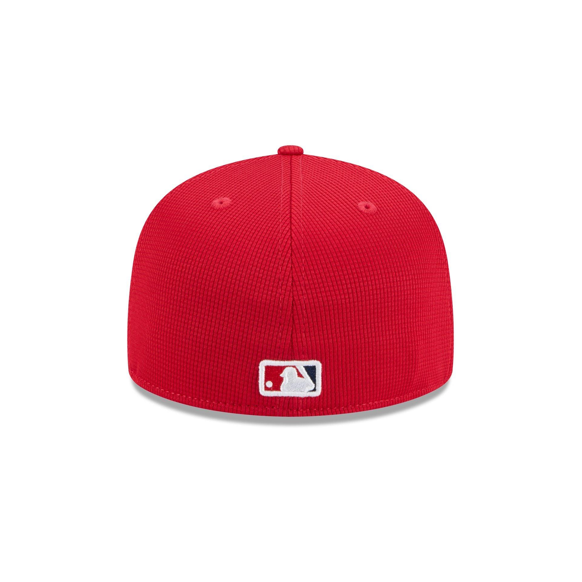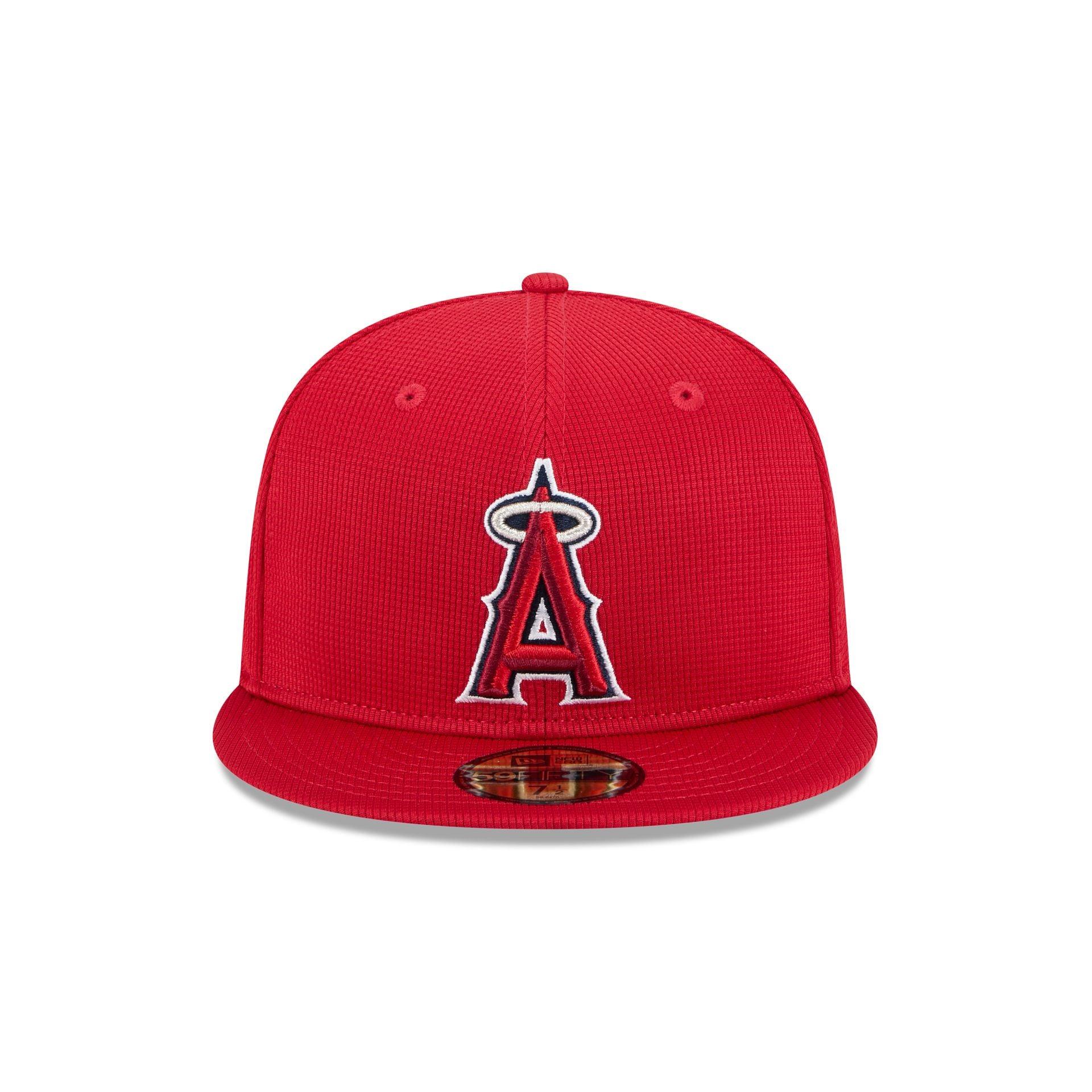 The Los Angeles Angels 2025 Spring Training 59FIFTY Fitted Cap features an embroidered Angels logo at the front panels with a matching MLB Batterman logo at the rear. Additional details include a pivot knit fabrication with a 2025 Spring Training patch at the right-wear side and a black undervisor.
