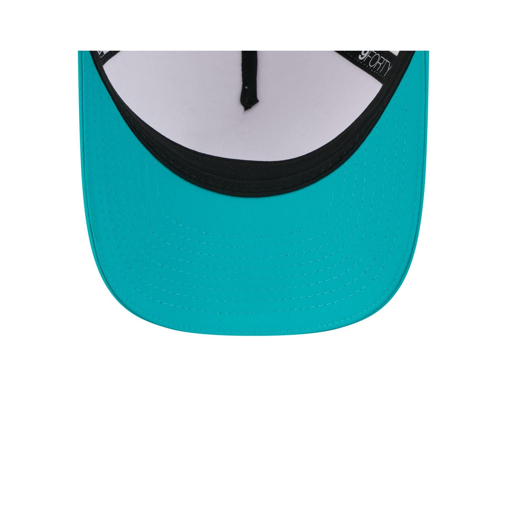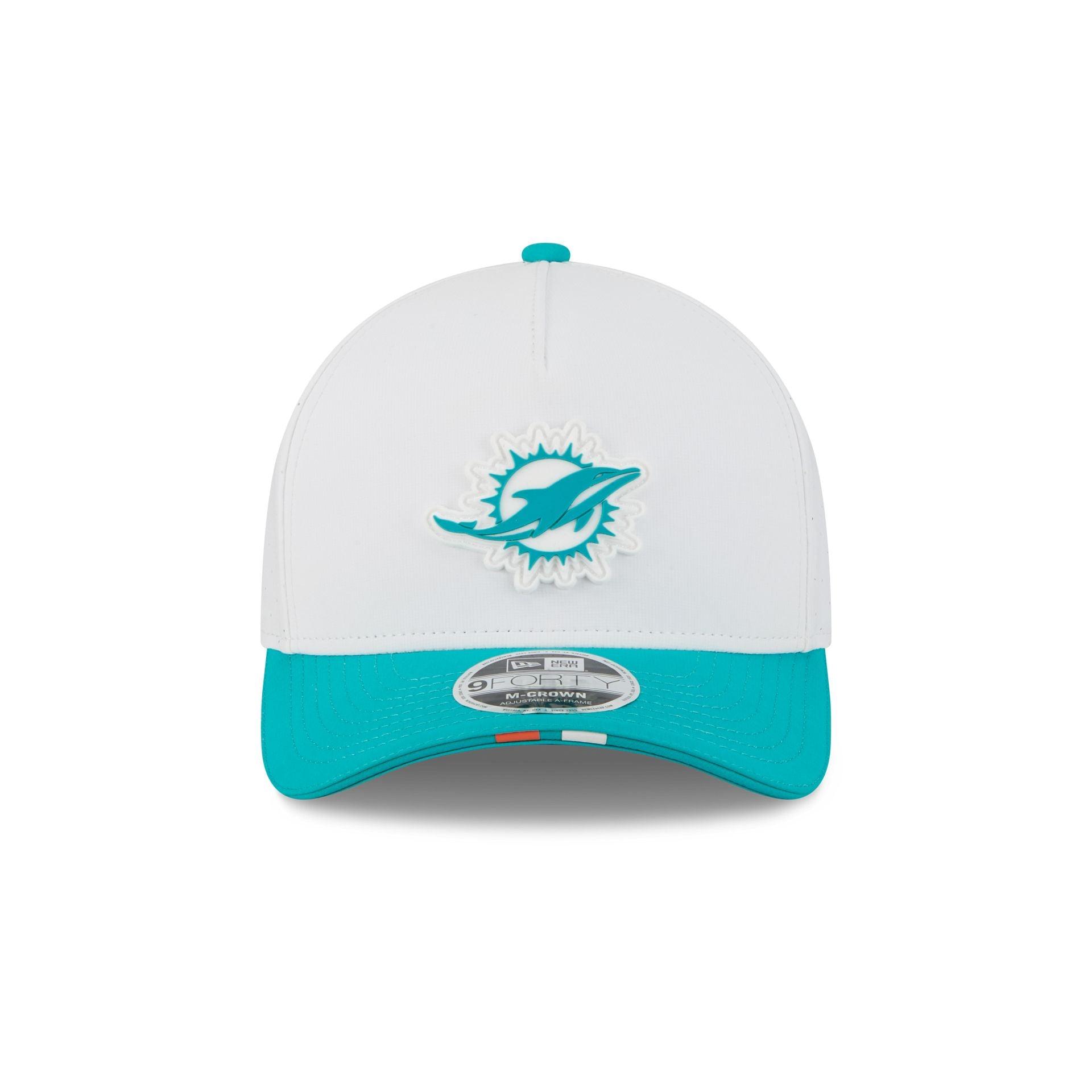 The Miami Dolphins 2025 Training 9FORTY M-Crown A-Frame Snapback features a silicone Dolphins patch at the front panel with team color stripes at the front of a teal visor. Additional details include a silicone NFL Shield patch on a woven foldover tab above a snapback closure at the rear.
