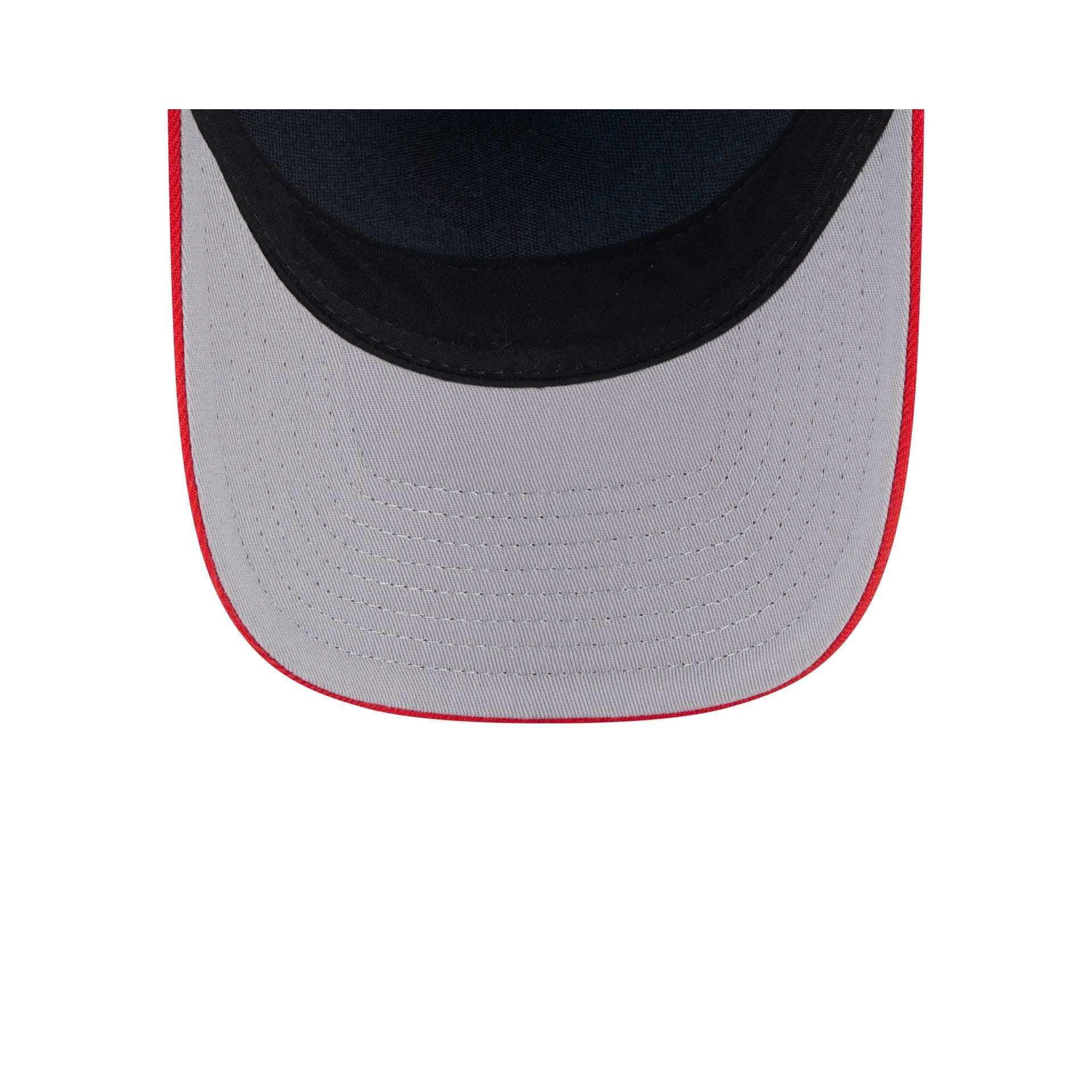 The Miami Marlins Independence Day 2025 9FORTY M-Crown A-Frame Trucker features an embroidered American flag themed Marlins logo at the front panels with a matching MLB Batterman logo above a snapback closure at the rear, a red visor, and a gray undervisor.