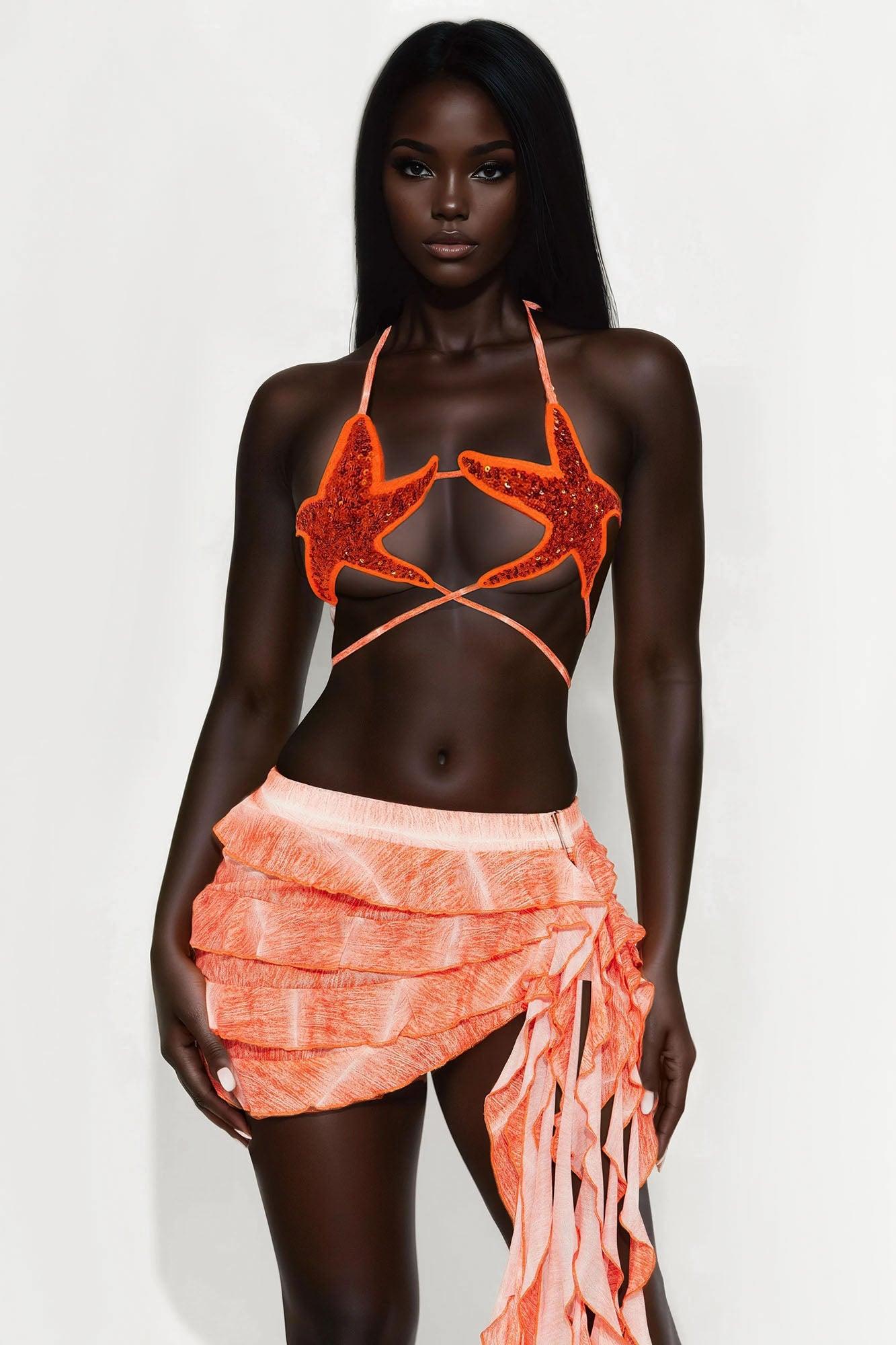 Available In Orange And Blue. Bralette And Skirt Set Stretch Open Back Ruffle Detail Elastic Waistband Self: 100% Polyester Bottom and Contrast: 98% Polyester 2% Spandex Lining: 95% Polyester 5% Spandex Imported California Proposition 65WARNING: Cancer and Reproductive Harm - www.P65Warnings.ca.gov.